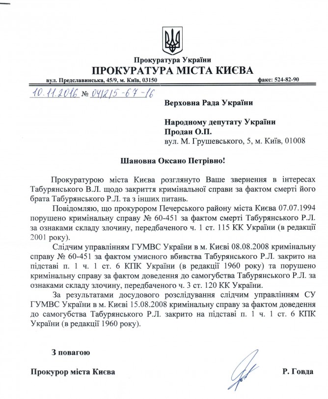 01Гру Коментування вимкнено Відповідь Прокуратури м. Києва на депутатське звернення щодо неналежного досудового розслідування кримінального провадження за фактом смерті Табурянського Р.Л. ДЕПУТАТСЬКЕ ЗВЕРНЕННЯ ВІДПОВІДЬ ГПУ ВІД 04.11.2016