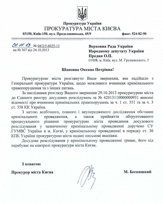 13Лис Коментування вимкнено Відповідь Прокуратури м. Києва про дослідження обставин кримінального провадження щодо створення перешкод діяльності народного депутата України та фальшування тексту законопроекту №2054а ДЕПУТАТСЬКЕ ЗВЕРНЕННЯ