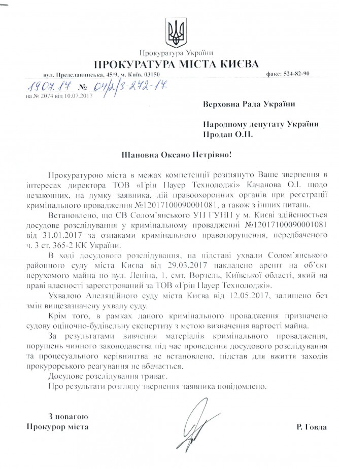 Відповідь Прокуратури міста Києва на депутатське звернення щодо можливих порушень законодавства співробітниками СВ Солом’янського УП ГУ НП в м. Києві