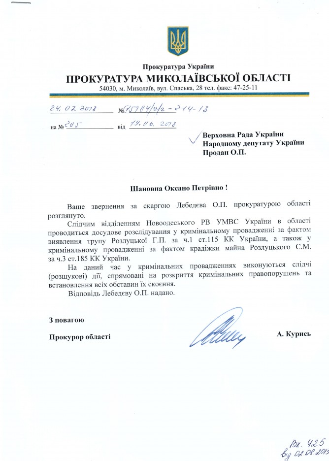Вхідна документація > Відповідь прокуратури Миколаївської області на депутатське звернення за заявою Лебєдєва О.П. щодо належного розслідування кримінального провадження за фактом вияалення трупу Роззлуцької Г.П. за ч.1 ст.115 КК України