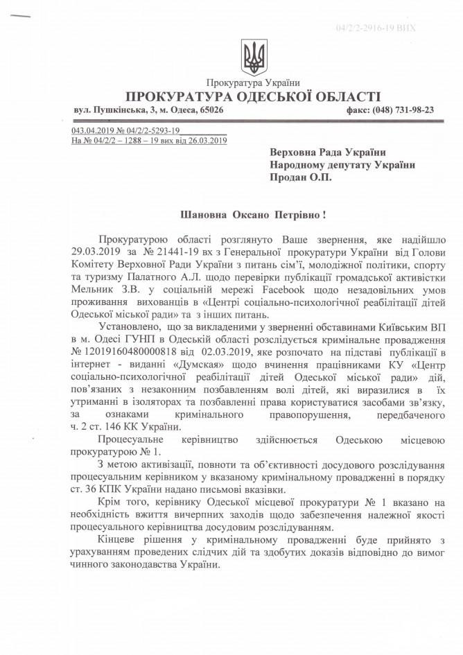 15Кві Коментування вимкнено Відповідь Прокуратури Одеської області на депутатське звернення щодо порушення прав дітей дирекцією та вихователями Одеського центру соціально-психологічної реабілітації дітей ДЕПУТАТСЬКЕ ЗВЕРНЕННЯ