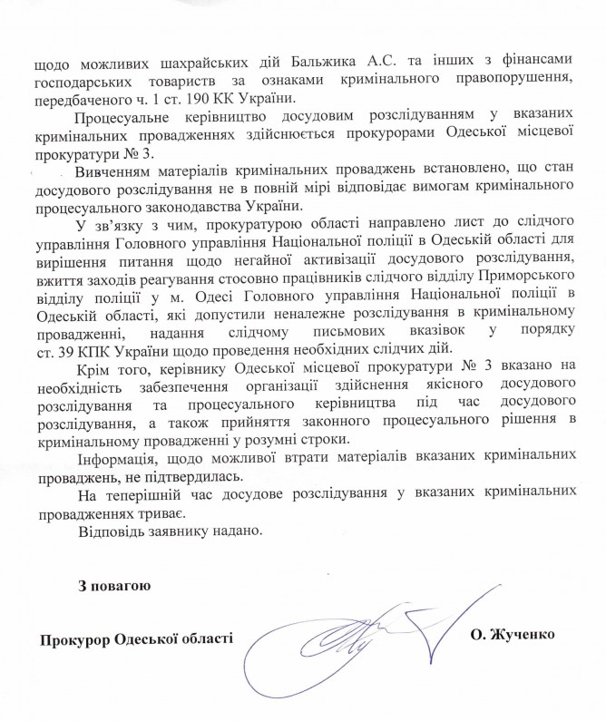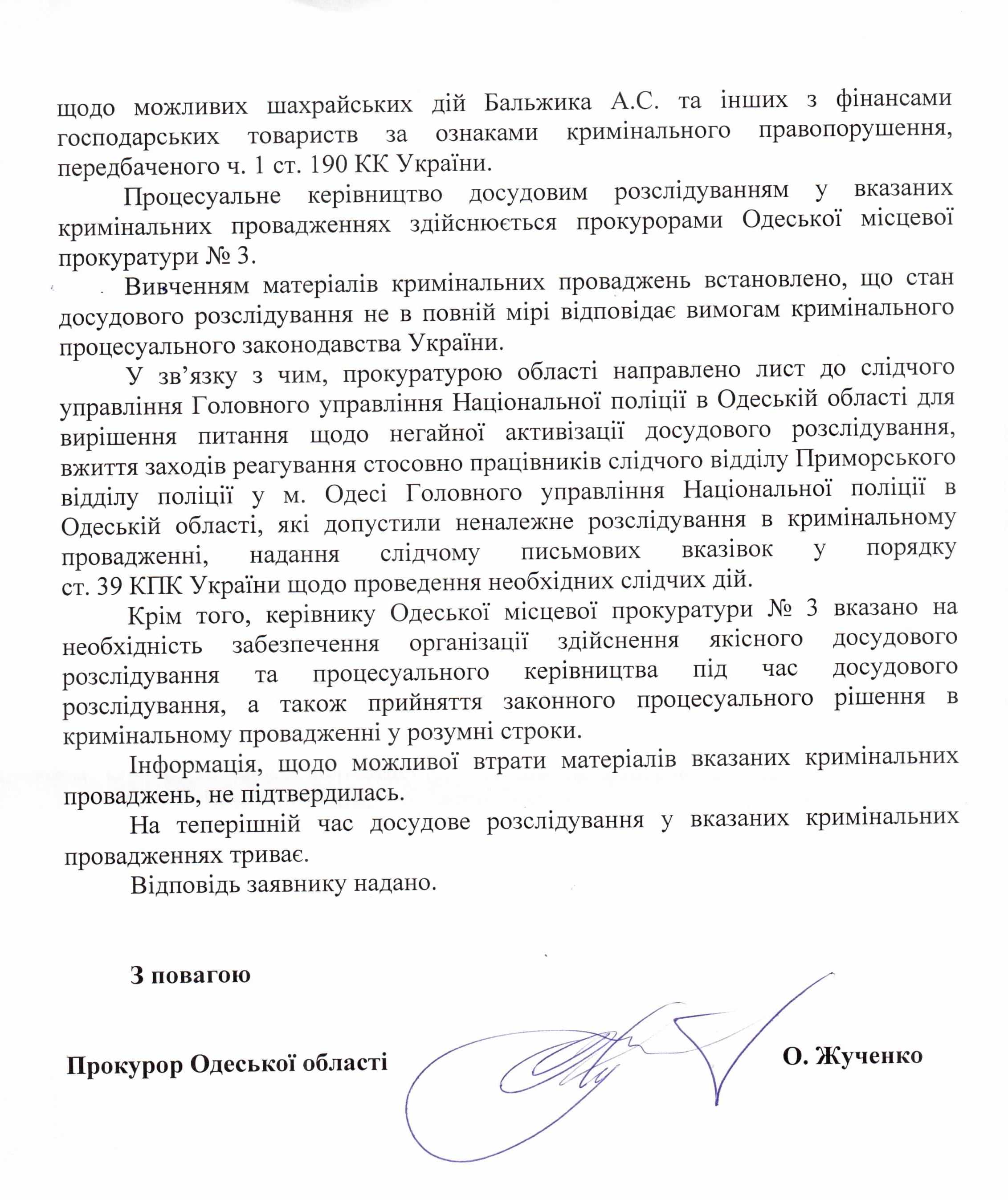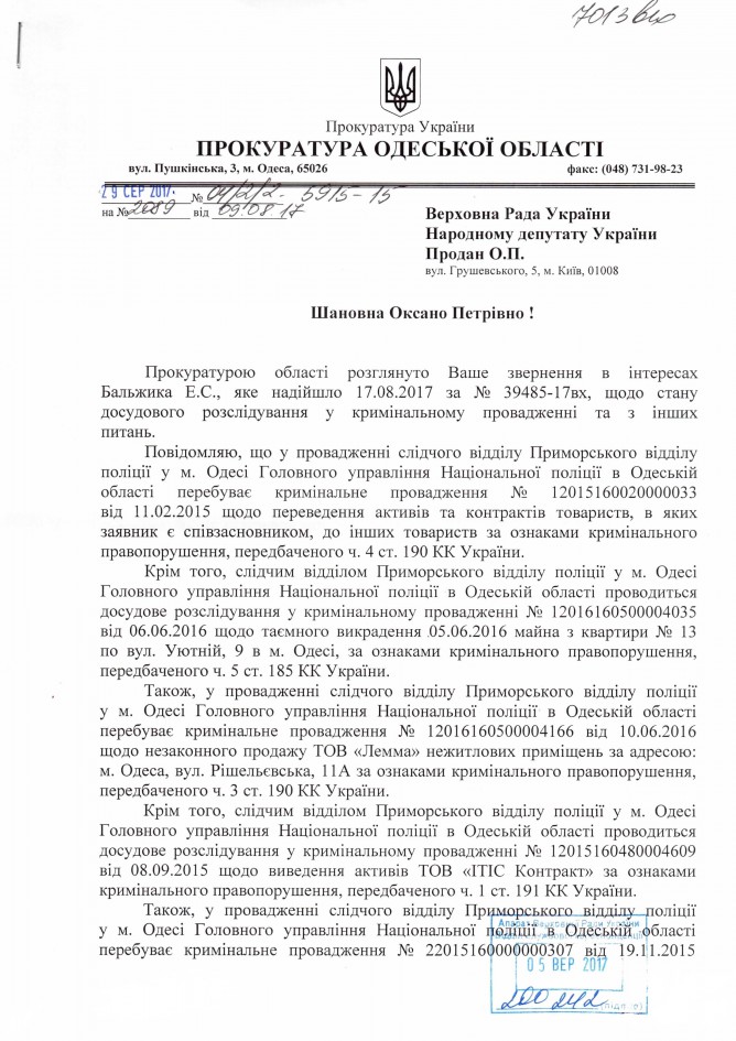 Вхідна документація > Відповідь Прокуратури Одеської області на депутатське звернення щодо порушення співробітниками правоохоронних органів м. Одеси кримінального процесуального законодавства та невиконання посадових обов’язків