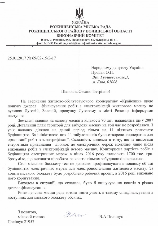 23Лют Коментування вимкнено Відповідь Рожищенської міської ради на депутатське звернення щодо питання електрифікації житлового масиву м. Рожище ДЕПУТАТСЬКЕ ЗВЕРНЕННЯ