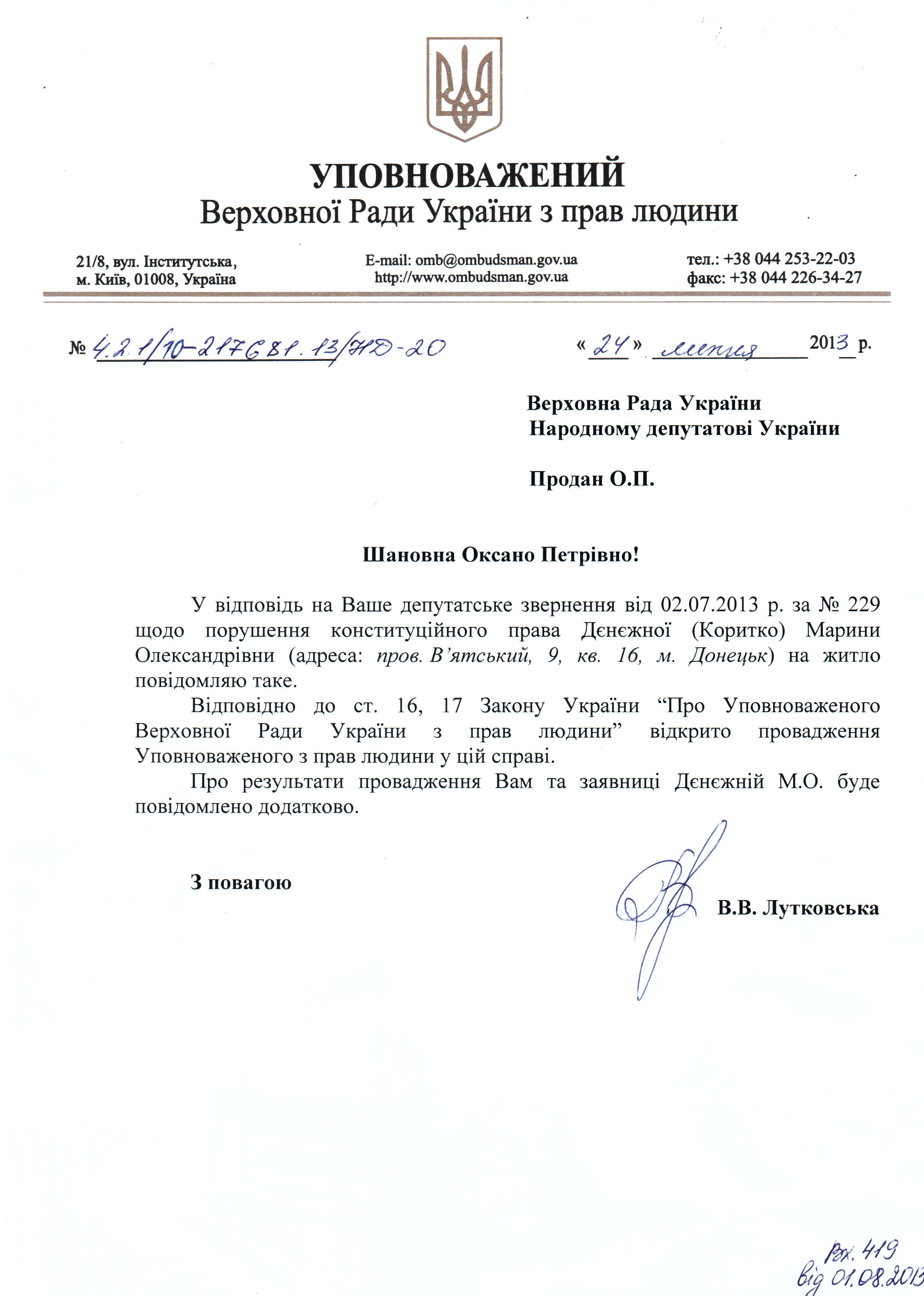 05Сер Коментування вимкнено Відповідь Уповноваженого Верховної Ради України з прав людини щодо відкриття провадження з приводу порушення конституційного права на житло Денєжної (Коритко) М.О.