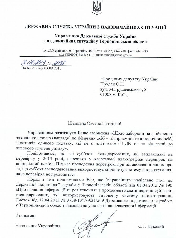 Вхідна документація > Відповідь Управління Державної служби України з надзвичайних ситуацій у Тернопільській області щодо заборони на здійснення заходів контролю (нагляду) до підприємців, платників єдиного податку, які не віднесені до високого ступеня ризику