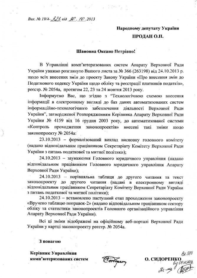 Головна > Верховна Рада України > Вхідна документація > Відповідь Управління компютеризованих систем Апарату Верховної Ради України щодо внесення змін на офіційному сайті Верховної Ради України до проекту Закону України “Про внесення змін до Податкового кодексу України щодо обліку та реєстрації платників податків”, реєстр. №2054а