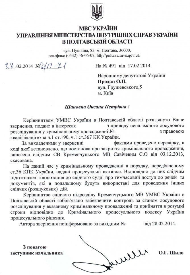 17Бер Коментування вимкнено Відповідь Управління МВС України в Полтавській області на депутатське звернення щодо неналежного досудового розслідування кримінального провадження