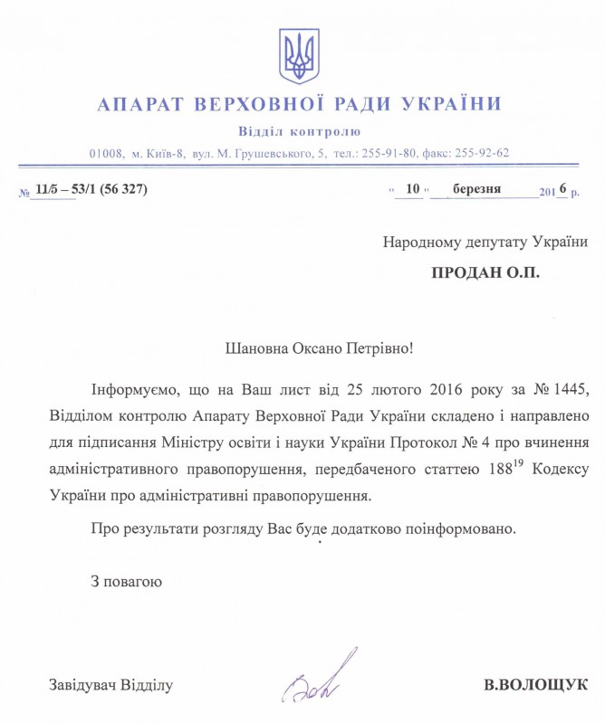 16Бер Коментування вимкнено Відповідь Відділу контролю Апарату ВРУ на депутатське звернення щодо ненадання відповіді на депутатське звернення посадовими особами Міністерства освіти і науки України ДЕПУТАТСЬКЕ ЗВЕРНЕННЯ