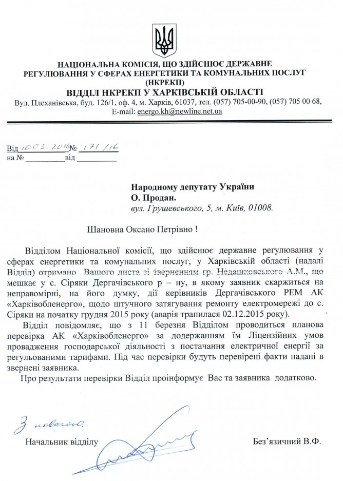 04Кві Коментування вимкнено Відповідь Відділу НКРЕКП у Харківській області на депутатське звернення щодо електропостачання у с.Сіряки Дергачівського району Харківської області ДЕПУТАТСЬКЕ ЗВЕРНЕННЯ