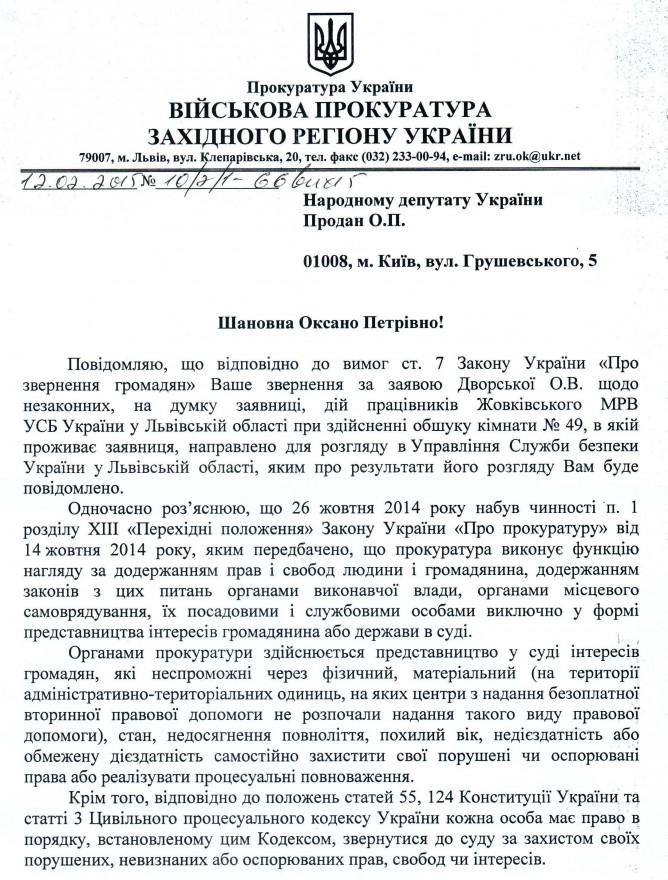 03Бер Коментування вимкнено Відповідь військової прокуратури Західного регіону на депутатське звернення за заявою Дворської О.В. щодо порушення прав внутрішньо переміщеної особи