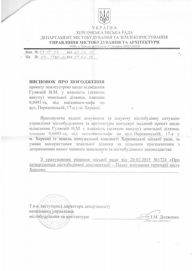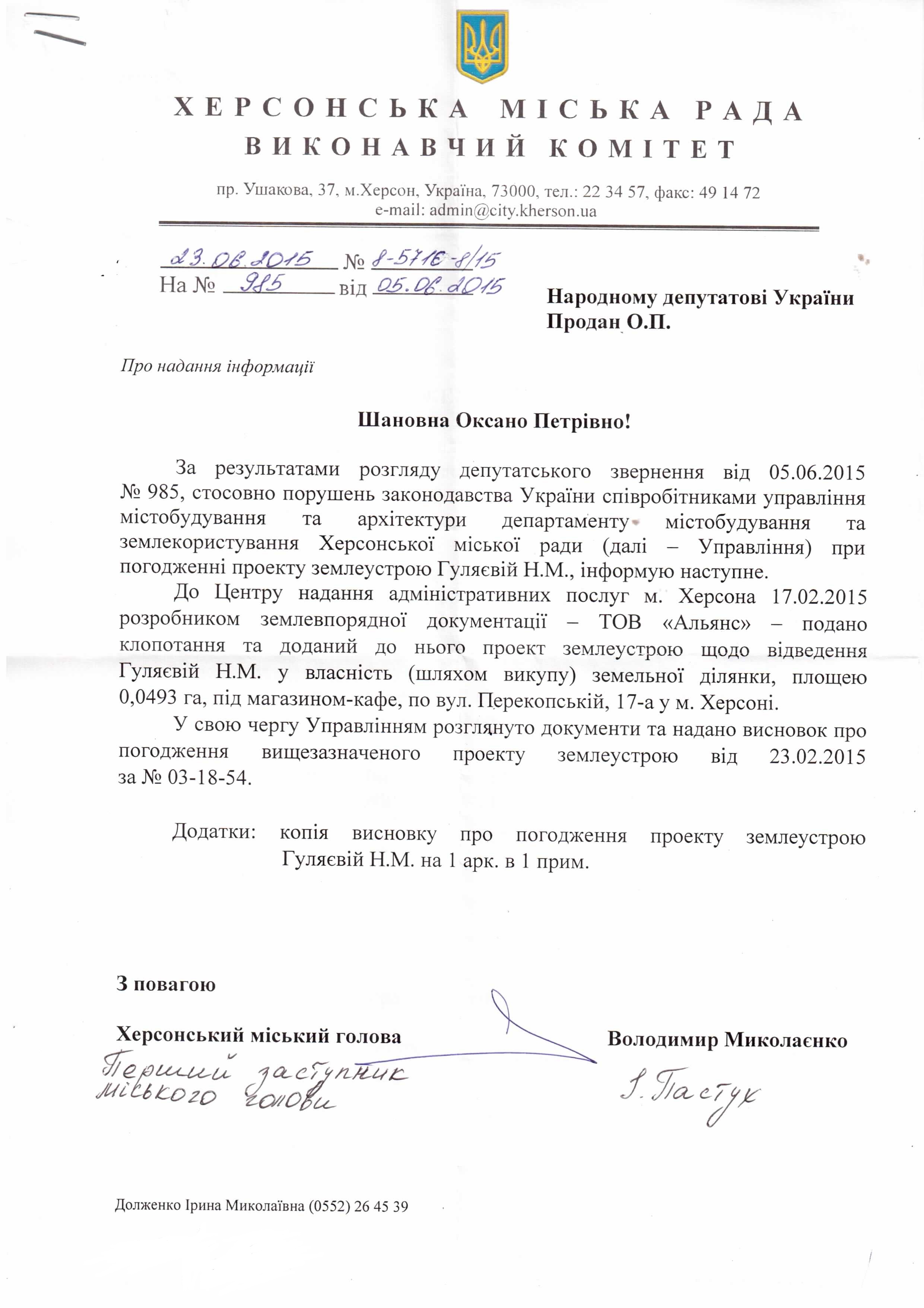 10Лип Коментування вимкнено Відповідь Виконавчого комітету Херсонської міської ради на депутатське звернення щодо можливих порушень при погодженні проекту землеустрою з відведення земельної ділянки ДЕПУТАТСЬКЕ ЗВЕРНЕННЯ