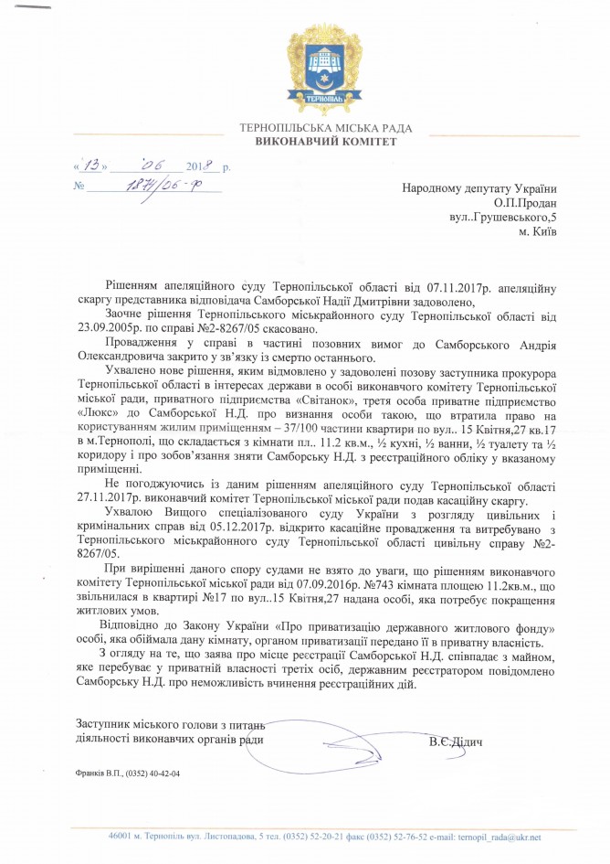 25Лип Коментування вимкнено Відповідь Виконавчого комітету Тернопільської міської ради на депутатське звернення щодо стану виконання рішення Апеляційного суду Тернопільської області від 07.11.2017 року ДЕПУТАТСЬКЕ ЗВЕРНЕННЯ