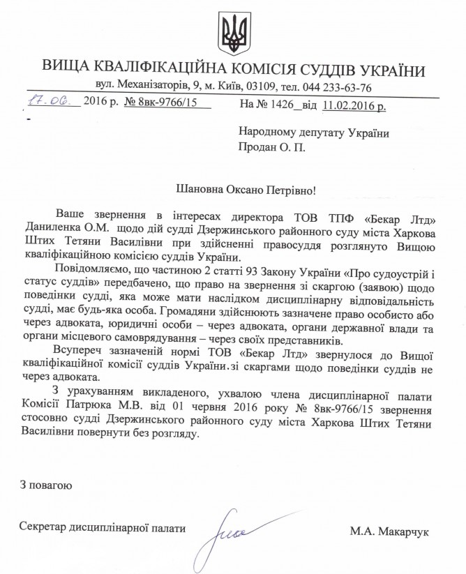 Відповідь Вищої кваліфікаційної комісії суддів України на депутатське звернення щодо можливого порушення законодавства суддею Дзержинського районного суду м. Харкова