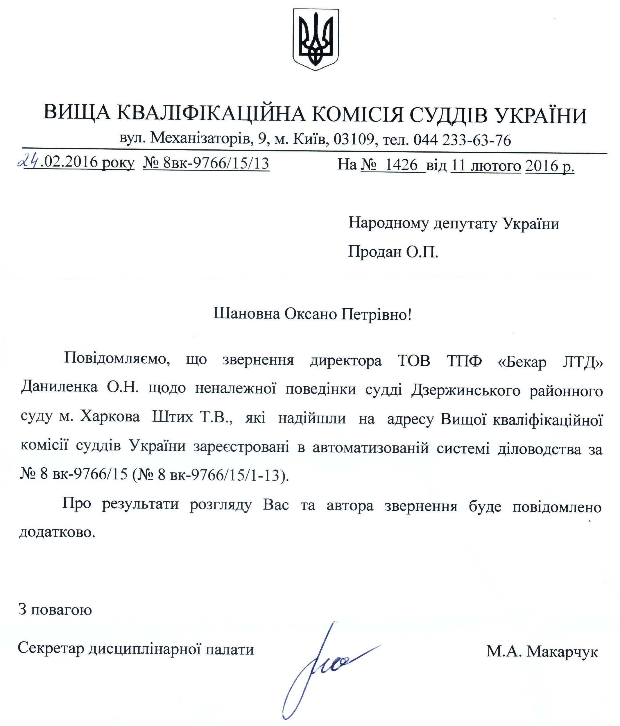 17Бер Коментування вимкнено Відповідь Вищої кваліфікаційної комісії суддів України на депутатське звернення щодо можливого порушення законодавства суддею Дзержинського районного суду м. Харкова ДЕПУТАТСЬКЕ ЗВЕРНЕННЯ