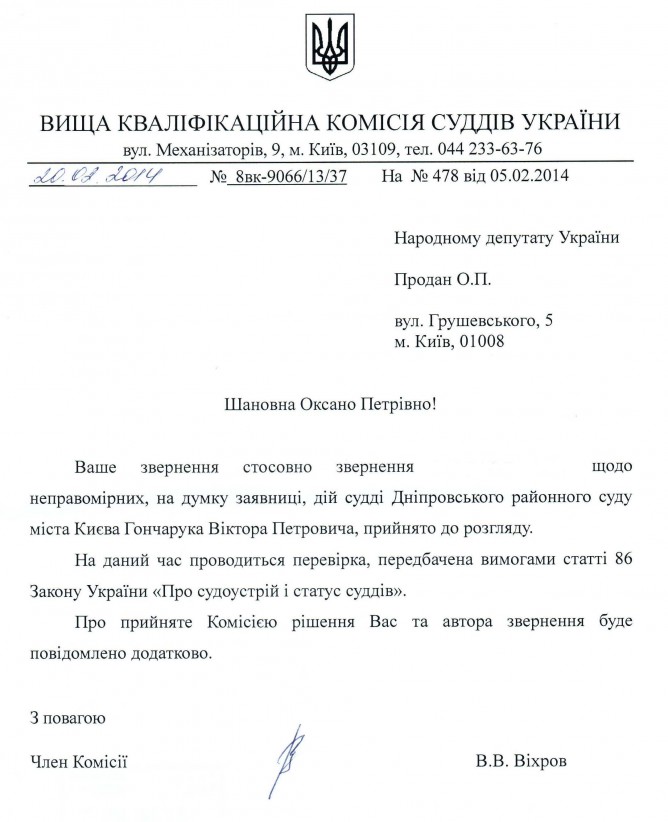 04Бер Коментування вимкнено Відповідь Вищої кваліфікаційної комісії суддів України на депутатське звернення щодо проведення перевірки правомірності дій судді Дніпровського районного суду м. Києва ДЕПУТАТСЬКЕ ЗВЕРНЕННЯ