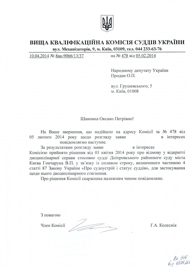 Відповідь Вищої кваліфікаційної комісії суддів України на депутатське звернення щодо розгляду скарги громадянина на дії судді Дніпровського районного суду міста Києва