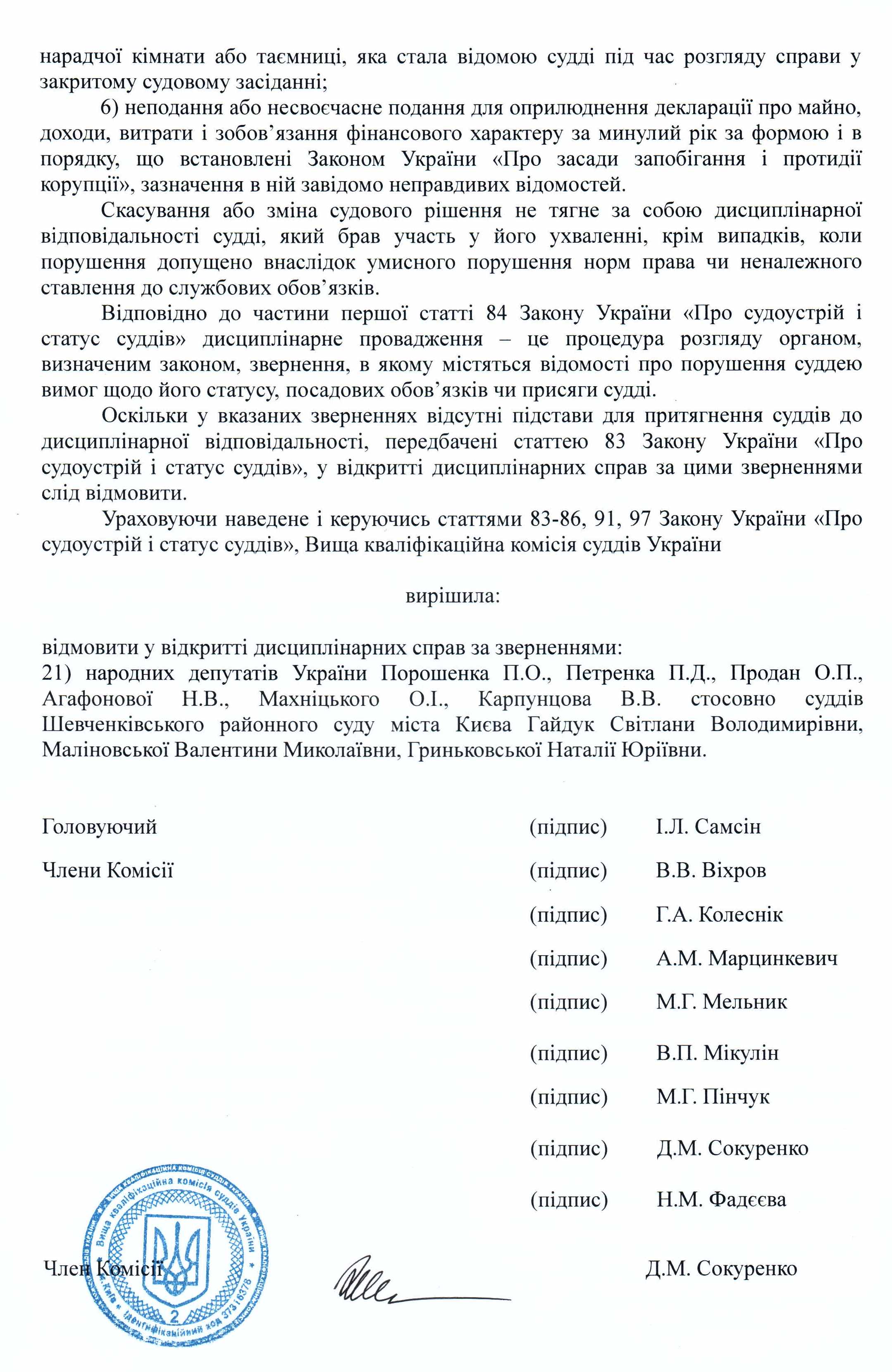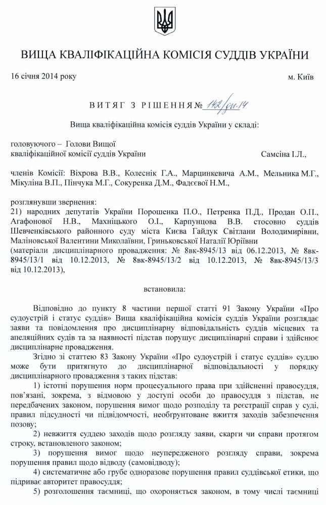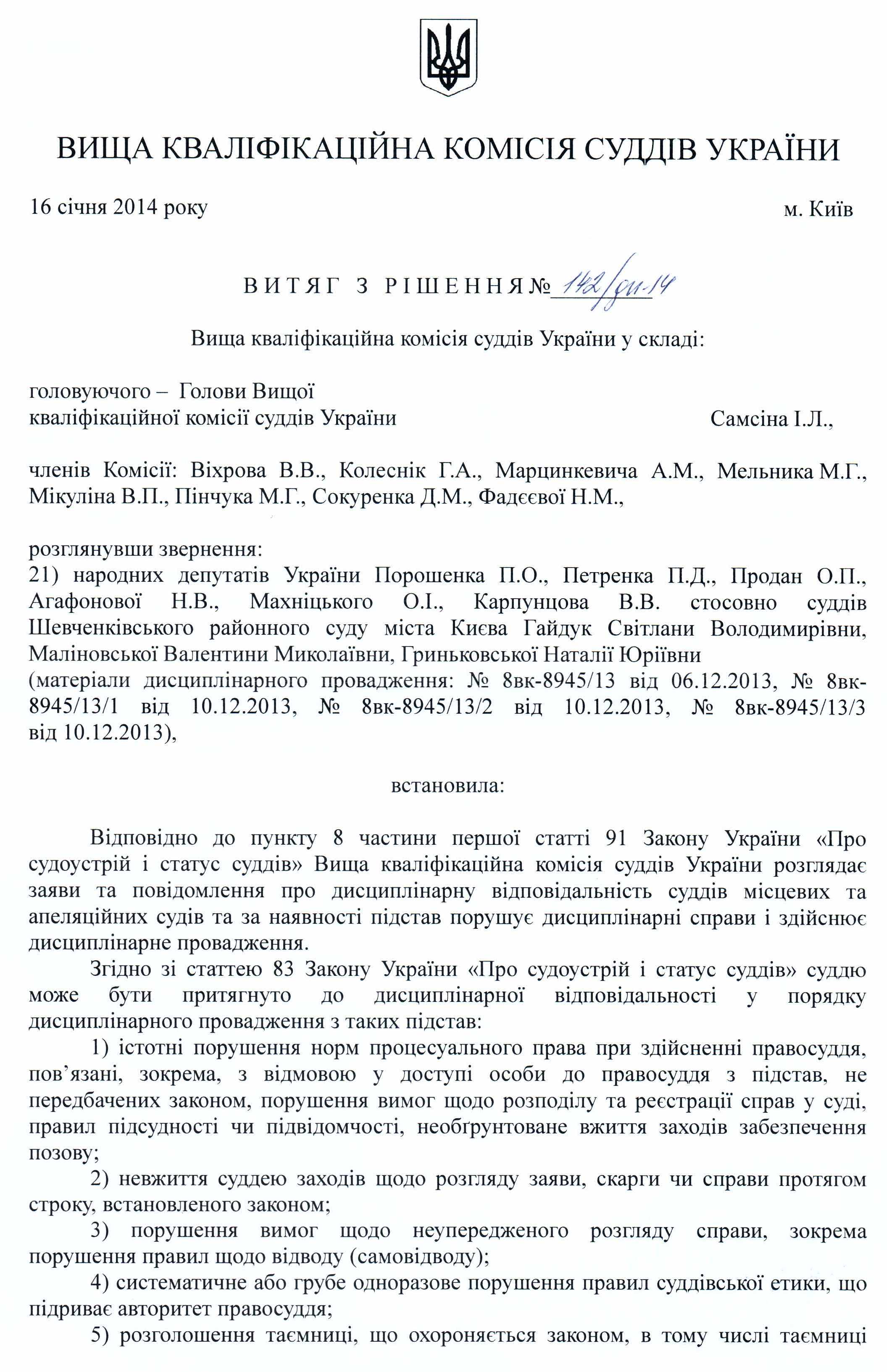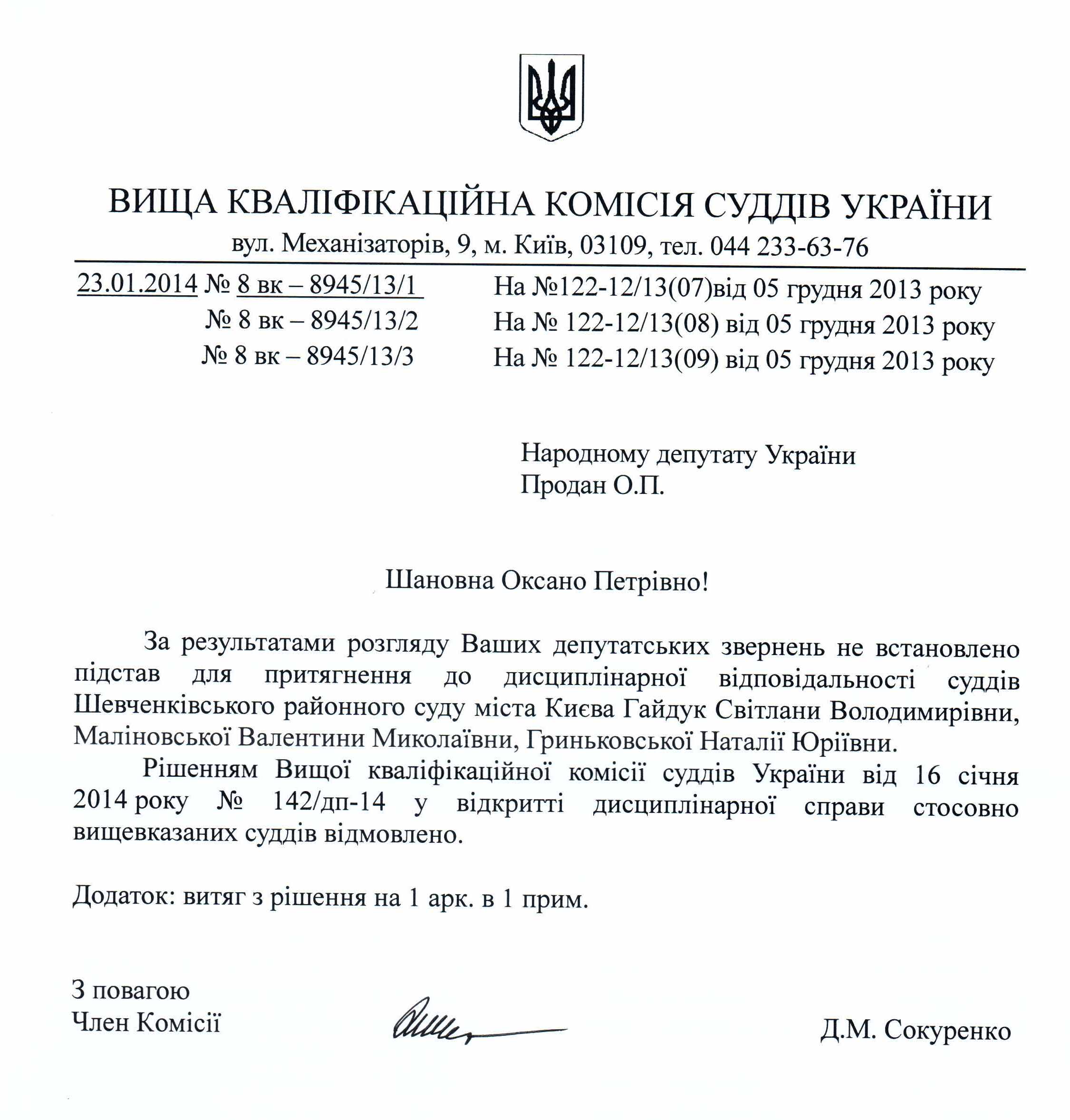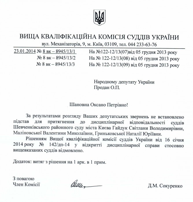 Вхідна документація > Відповідь Вищої кваліфікаційної комісії суддів України на спільне депутатське звернення щодо притягнення до дисциплінарної відповідальності суддів Шевченківського району м. Києва за неправомірні дії під час розгляду справ щодо подій, які відбулися під час акції протесту на вул. Банковій 01.12.2013 р.