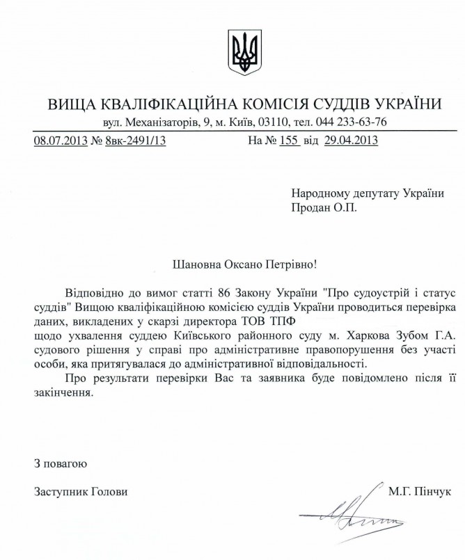 Вхідна документація > Відповідь Вищої кваліфікаційної комісії суддів України щодо проведення перевірки даних стосовно ухвали суддею Київського районного суду м. Харкова рішення за відсутності особи, яка притягалася до адміністративної відповідальності