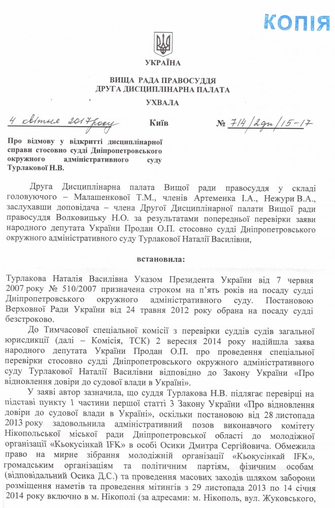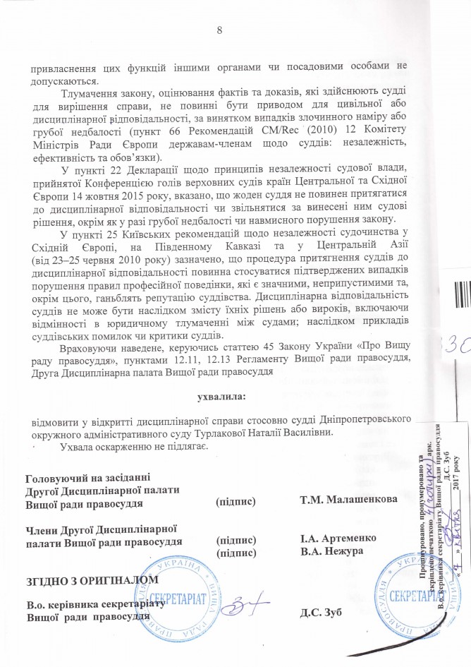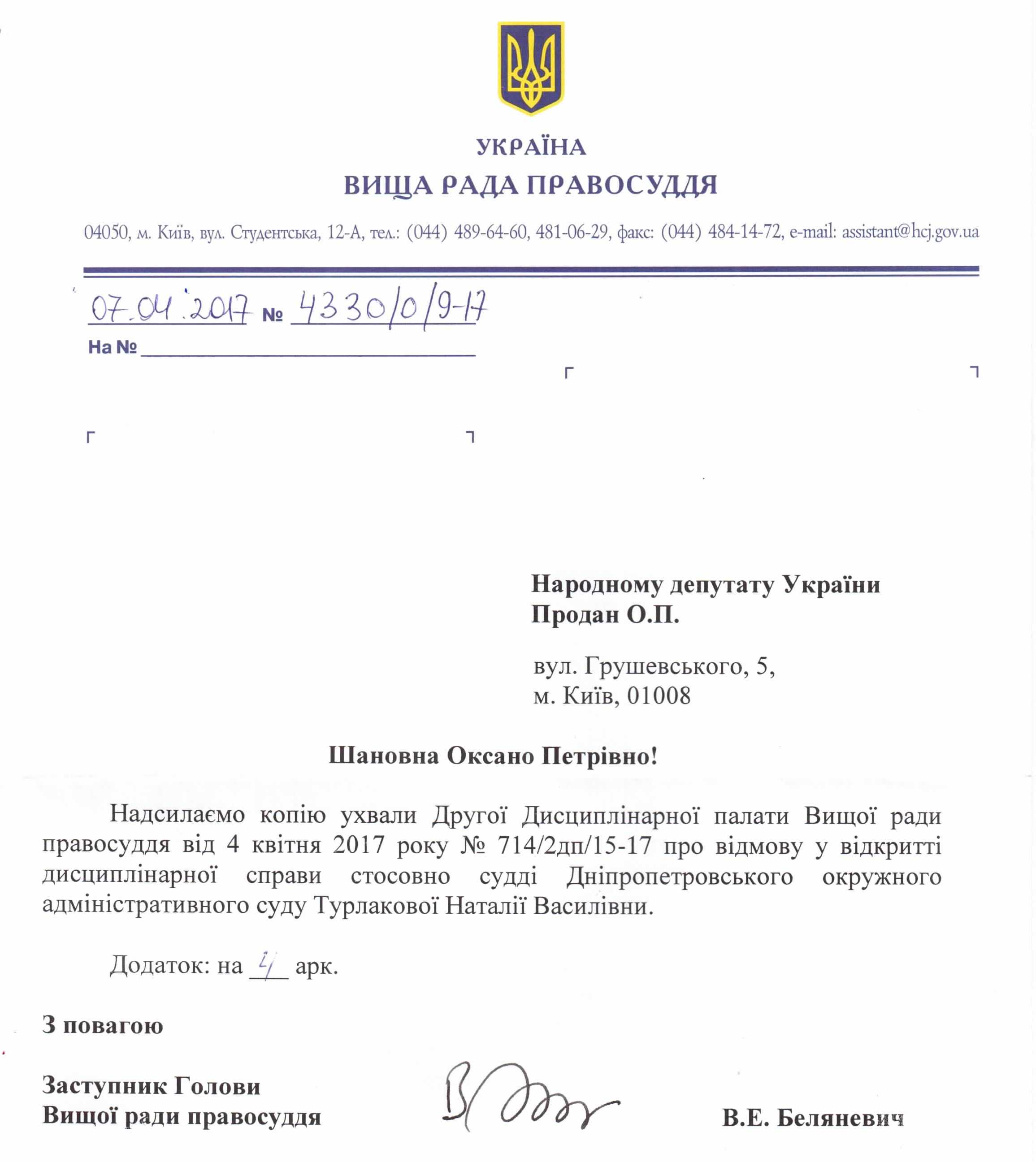 19Кві Коментування вимкнено Відповідь Вищої ради правосуддя на депутатське звернення щодо притягнення до відповідальності судді Дніпропетровського окружного адміністративного суду Н.В. Турлакової ДЕПУТАТСЬКЕ ЗВЕРНЕННЯ