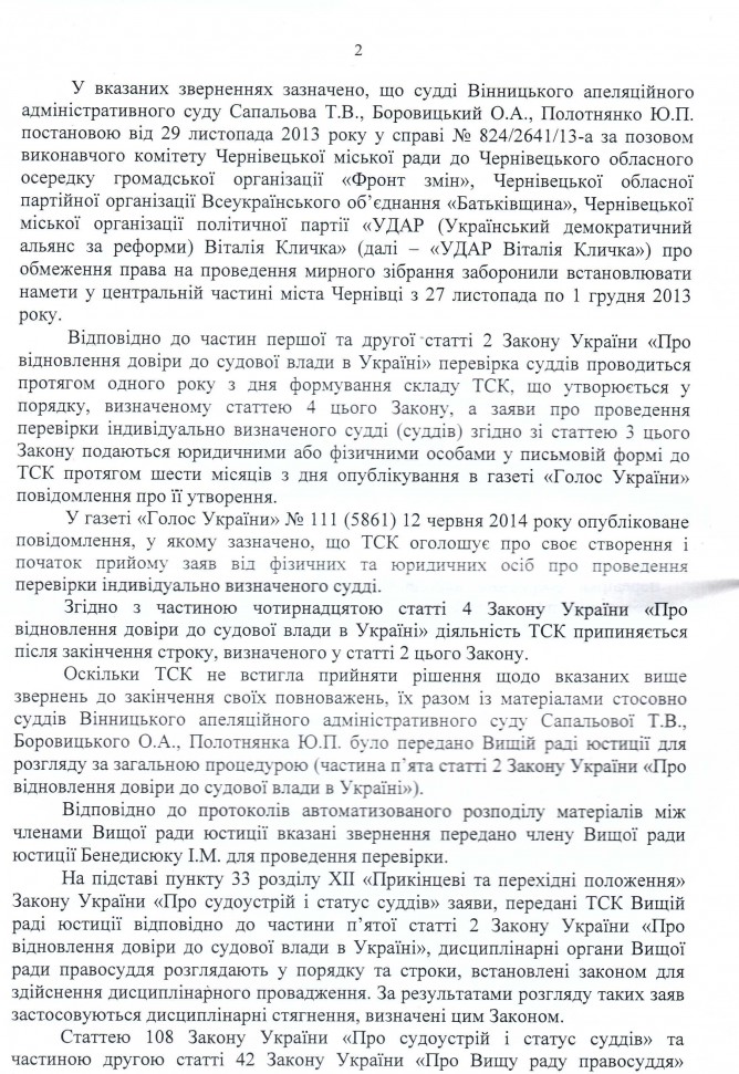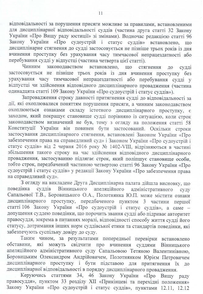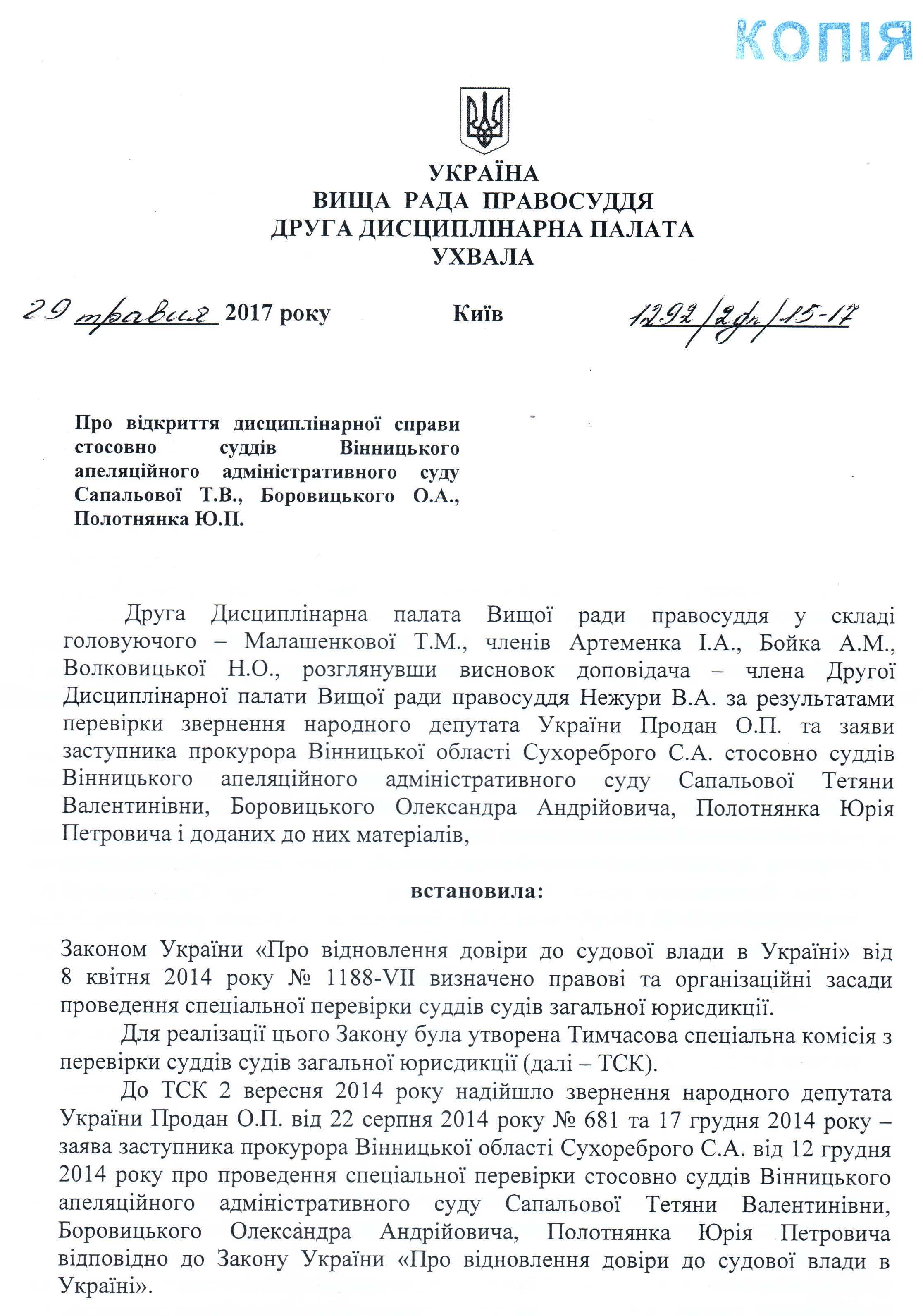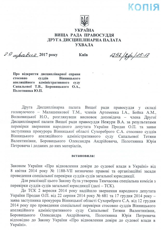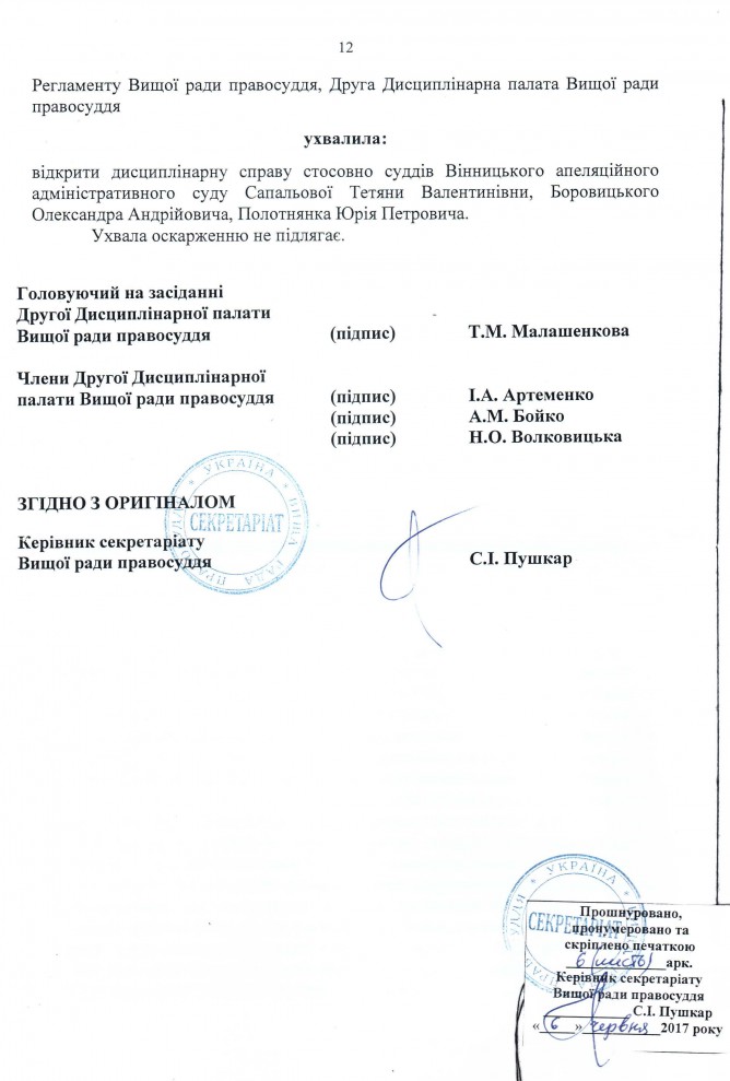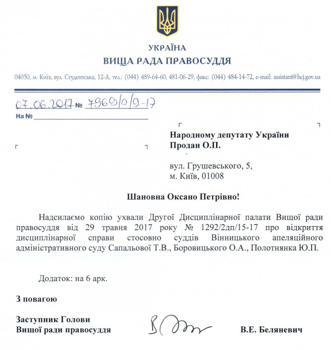 Вхідна документація > Відповідь Вищої ради правосуддя на депутатське звернення щодо притягнення до відповідальності суддів Вінницького апеляційного адміністративного суду Т.В. Сапальової, О.А. Боровицького та Ю.П. Полотнянка