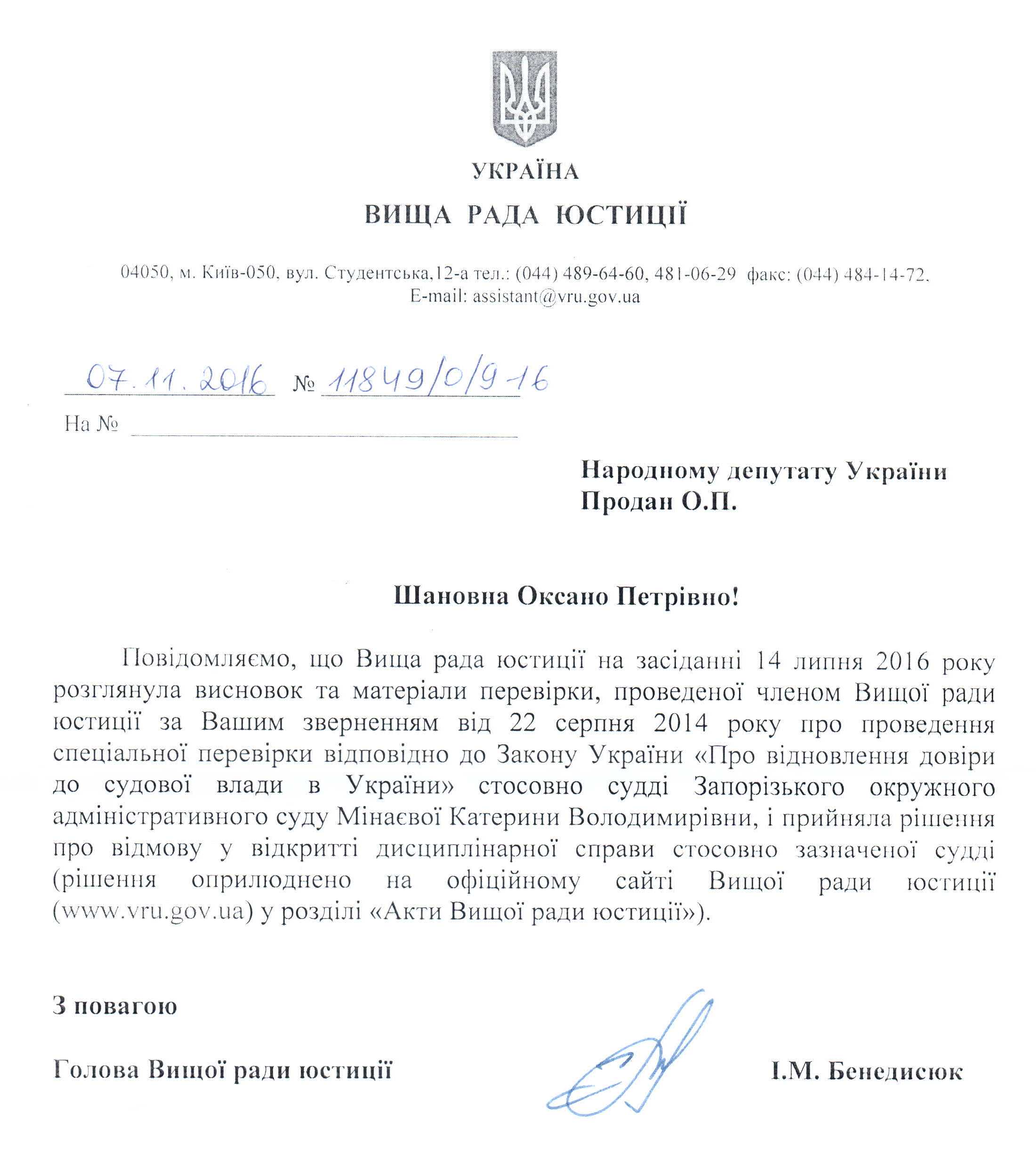 Відповідь Вищої ради юстиції на депутатське звернення щодо притягнення до відповідальності судді Запорізького окружного адміністративного суду Мінаєвої К.В., рішення якої порушили конституційні права та основоположні свободи громадян України