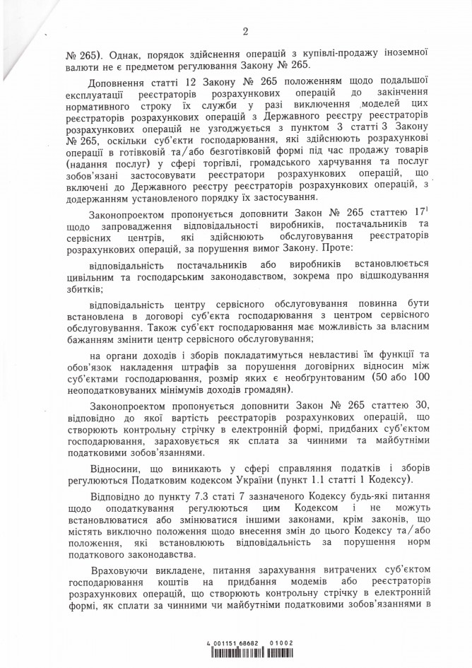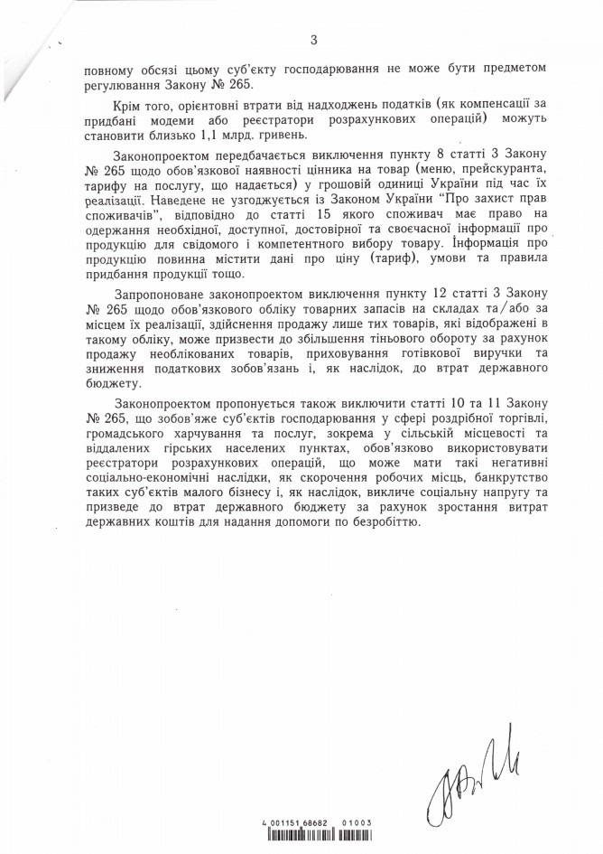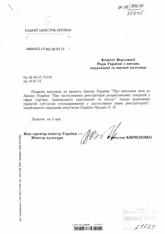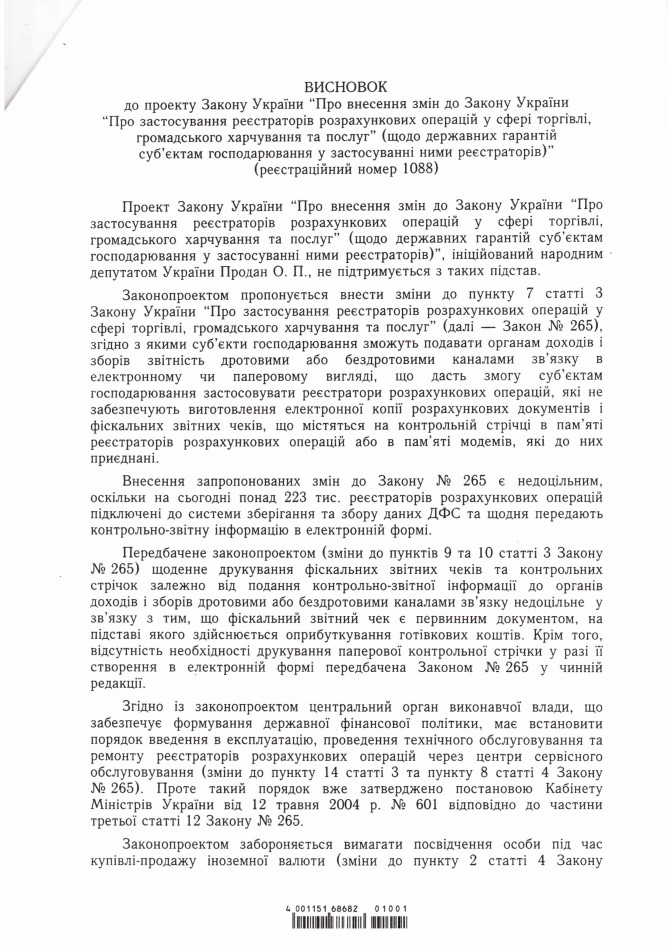 Вхідна документація > Висновок Кабінету Міністрів України до проекту Закону України “Про внесення змін до Закону України “Про застосування реєстраторів розрахункових операцій у сфері торгівлі, громадського харчування та послуг” (щодо державних гарантій суб’єктам господарювання у застосуванні ними реєстраторів)”, реєстр. №1088