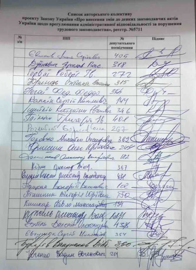 Законопроект “Про внесення змін до деяких законодавчих актів України щодо врегулювання адміністративної відповідальності за порушення трудового законодавства”, реєстр. №5711, ініціатором якого є народний депутат України Оксана Продан, вже підтримали 66 народних депутатів з різних депутатських фракцій і груп.