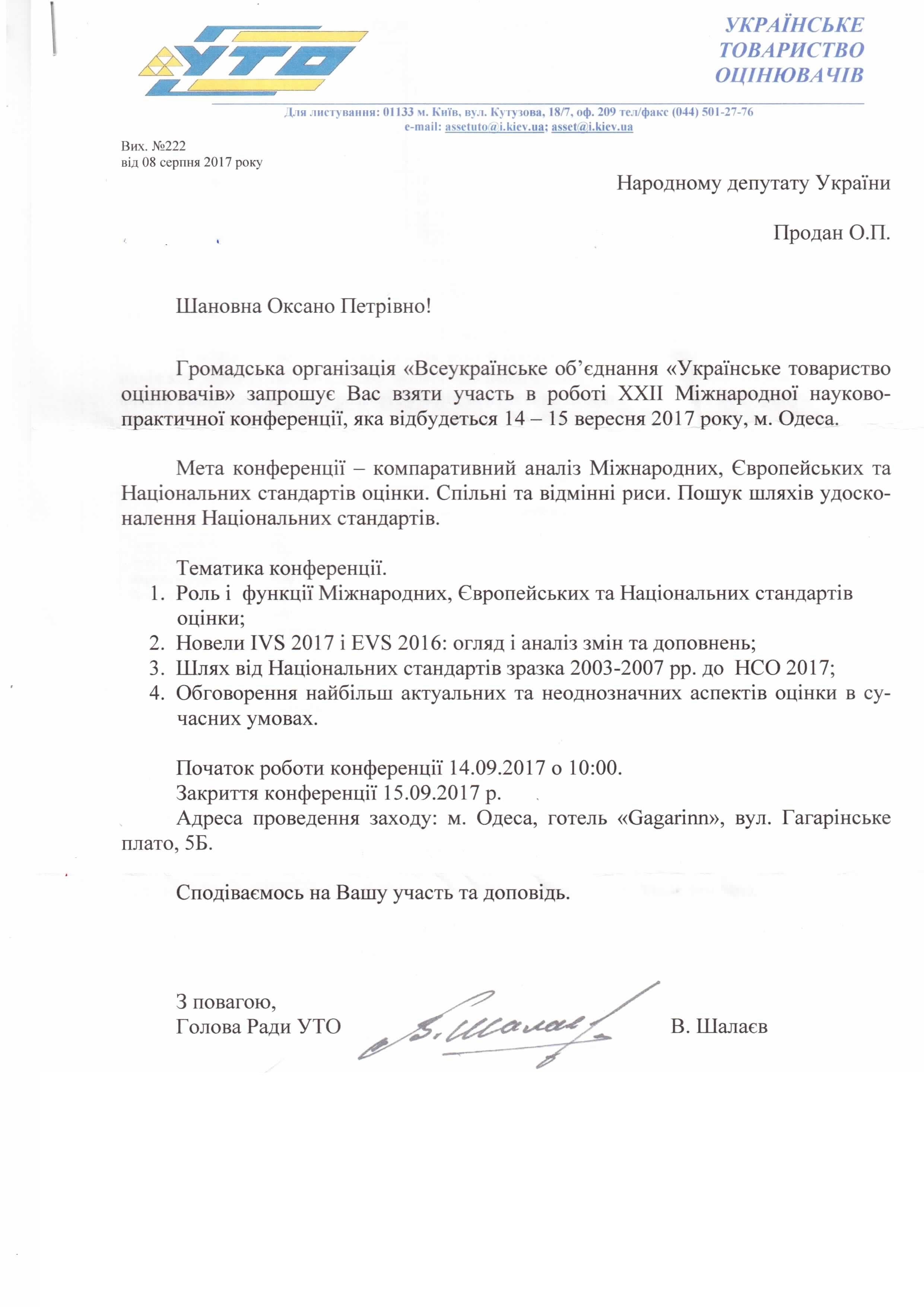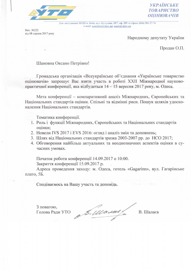 Головна > Верховна Рада України > Вхідна документація > Запрошення ГО “Всеукраїнське об’єднання “Українське товариство оцінювачів” на ХХІІ Мінжнародну науково-практичну конференцію 14-15 вересня 2017 року у м. Одеса