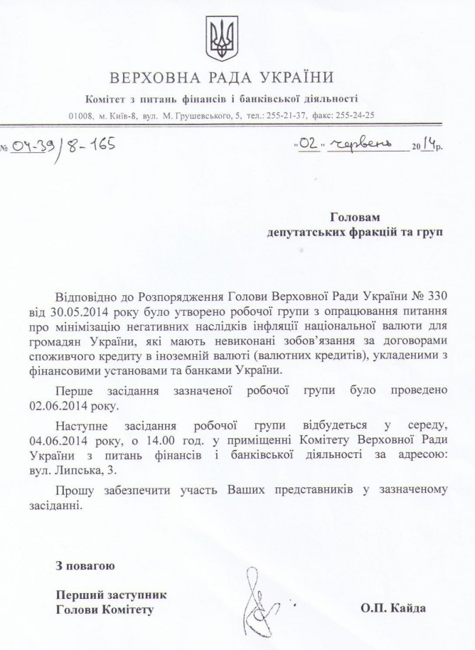 Вхідна документація > Запрошення Комітету ВРУ з питань фінансів і банківської діяльності на засідання робочої групи з опрацювання питання про мінімізацію негативних наслідків інфляції національної валюти для громадян України, які мають споживчі валютні кредити