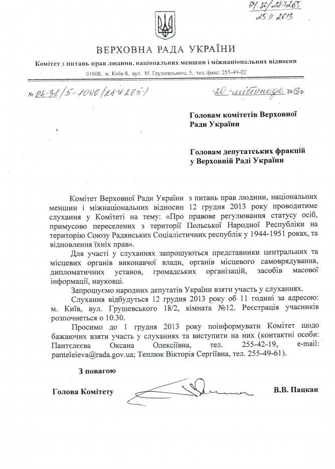 Вхідна документація > Запрошення Комітету ВРУ з питань прав людини, нацменшин і міжнаціональних відносин на комітетські слухання “Про правове регулювання статусу осіб, примусово переселених з території Польської Народної Республіки на територію СРСР у 1944-1951 роках, та відновлення їхніх прав”