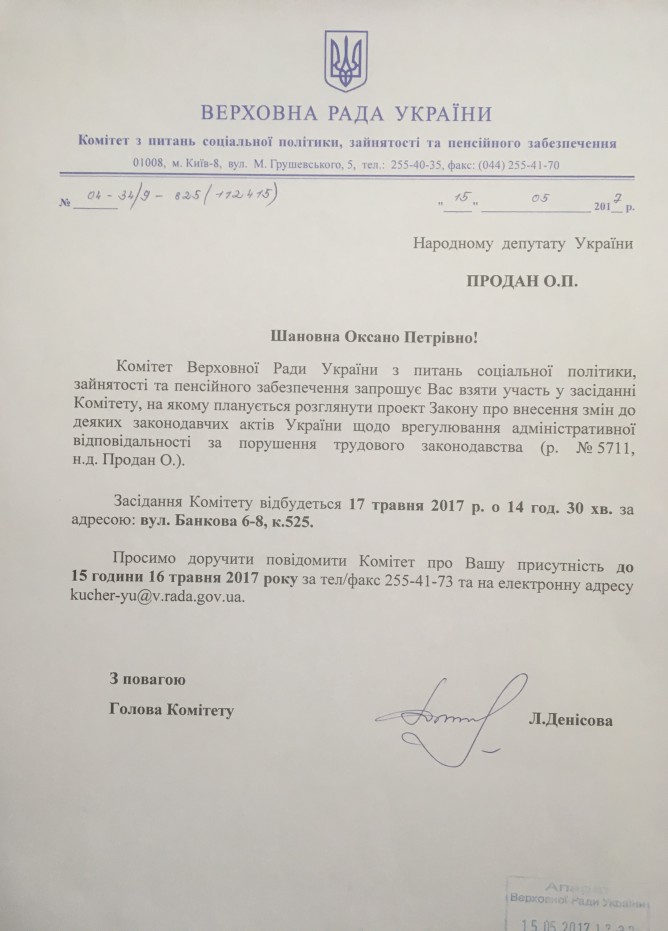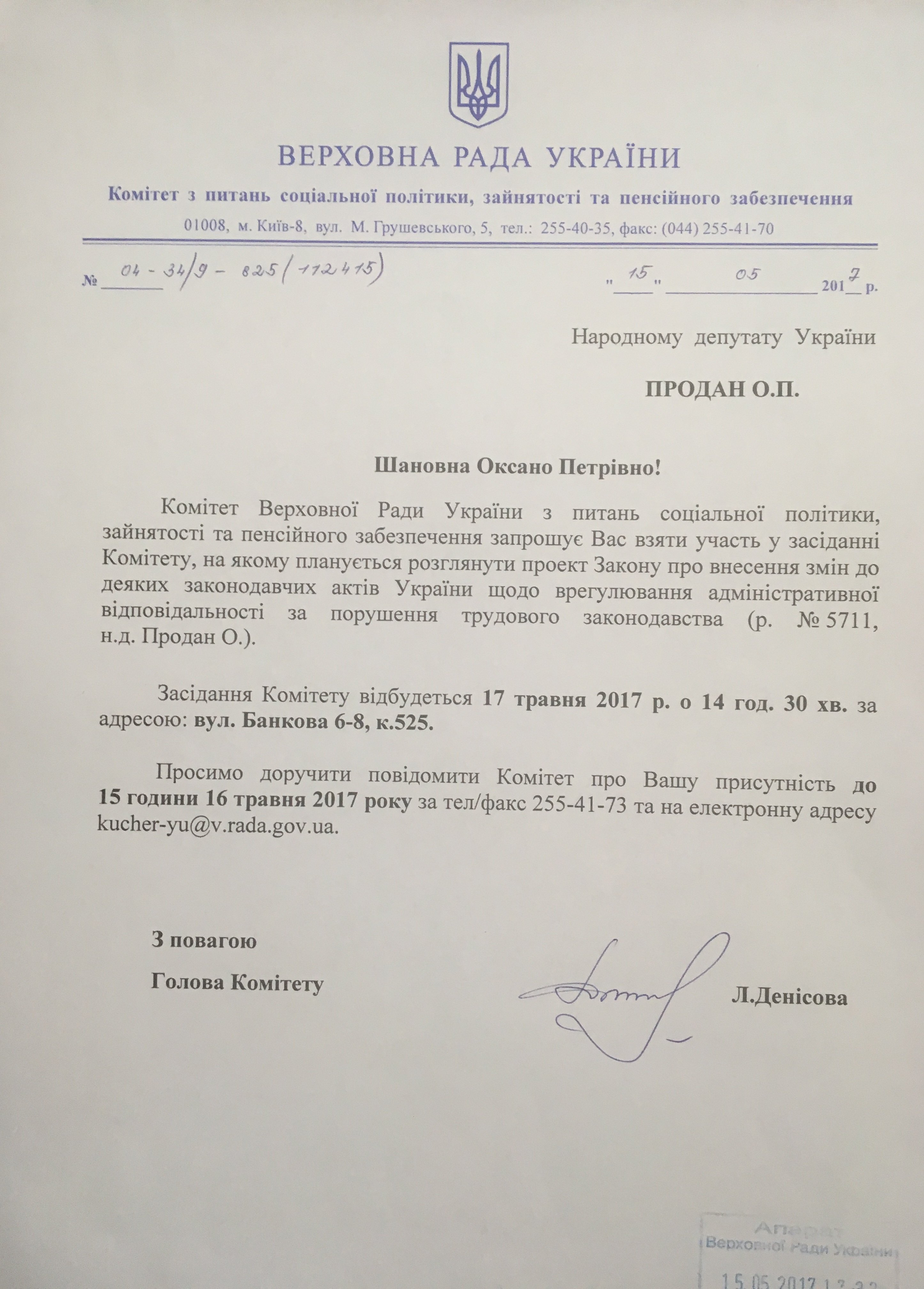 Вхідна документація > Запрошення Комітету ВРУ з питань соціальної політики, зайнятості та пенсійного забезпечення на засідання Комітету, на якому розглядатиметься законопроект “Про внесення змін до деяких законодавчих актів України щодо врегулювання адміністративної відповідальності за порушення трудового законодавства”, реєстр. №5711