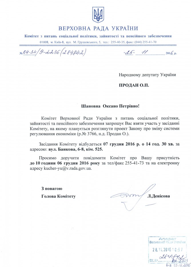 Запрошення Комітету ВРУ з питань соціальної політики, зайнятості та пенсійного забезпечення на засідання Комітету, на якому розглядатиметься законопроект “Про зміну системи регулювання економіки”, реєстр. №3766