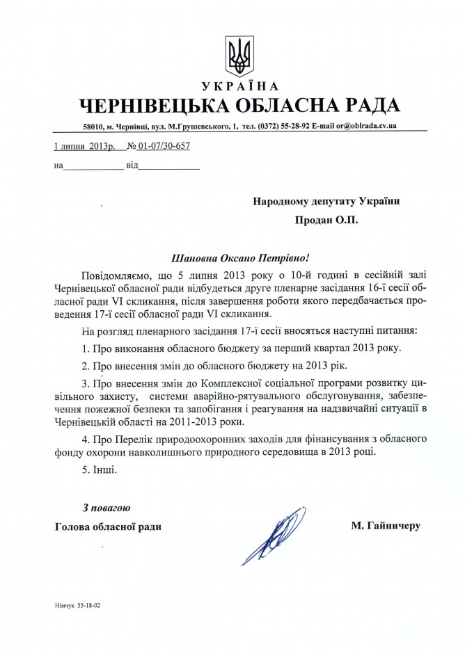 > Повідомлення про пленарне засідання Чернівецької обласної ради