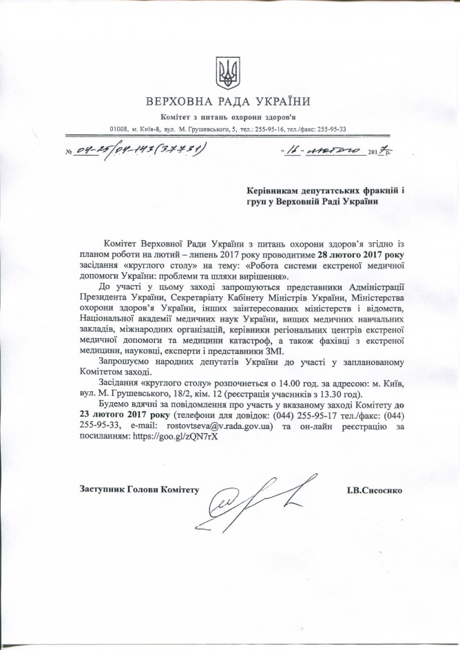 20Лют Коментування вимкнено Запрошення від Комітету ВРУ з питань охорони здоров’я на засідання “круглого столу” на тему: “Робота системи екстреної медичної допомоги України: проблеми та шляхи вирішення”