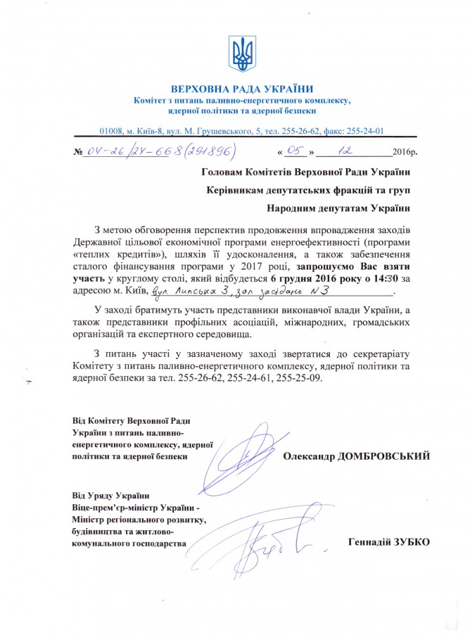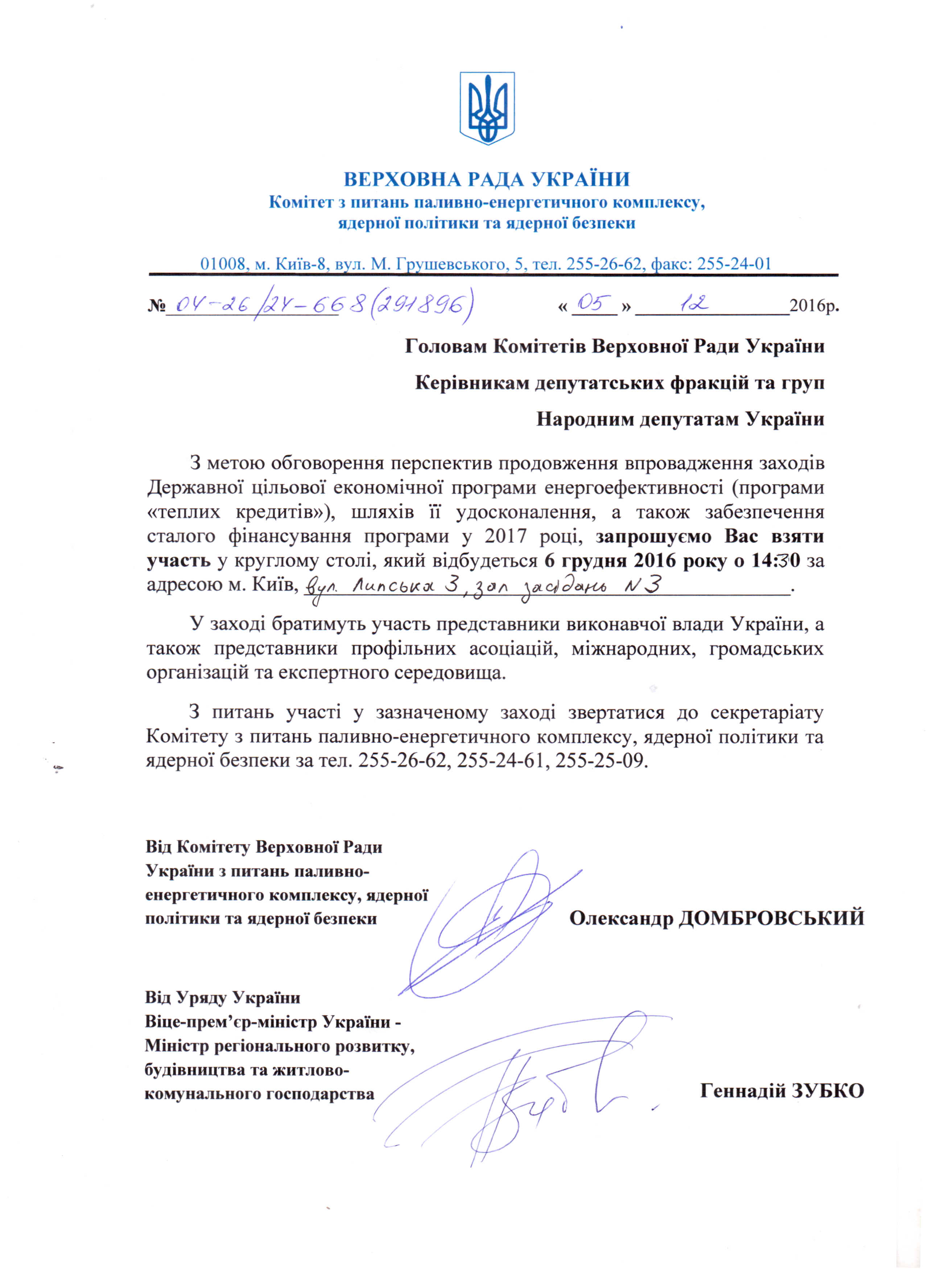 05Гру Коментування вимкнено Запрошення від Комітету ВРУ з питань паливно-енергетичного комплексу, ядерної політики та ядерної безпеки на круглий стіл з обговорення заходів Державної програми “теплих кредитів”