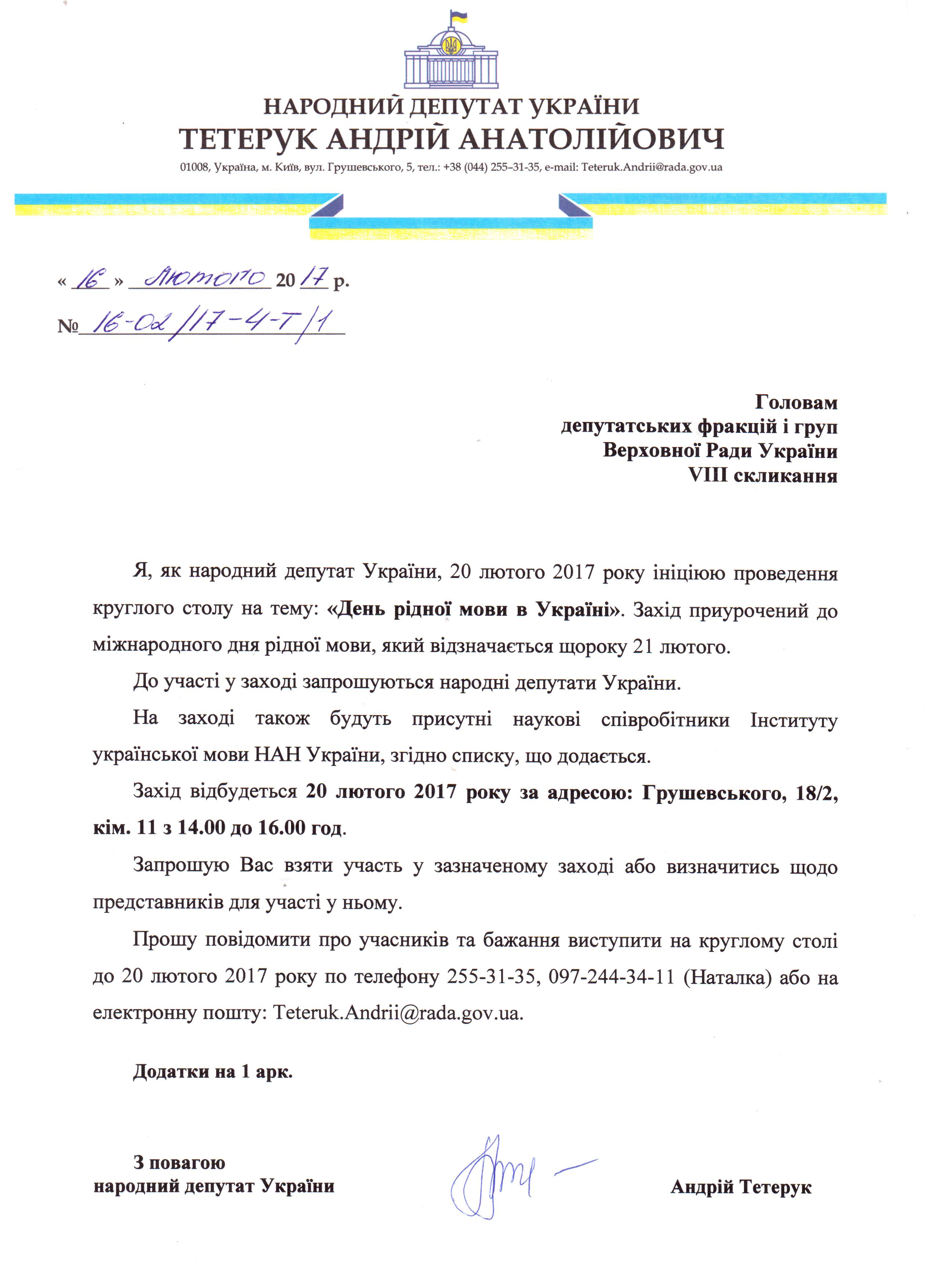Головна > Верховна Рада України > Вхідна документація > Запрошення від народного депутата України Тетерука А.А. на засідання круглого столу “День рідної мови в Україні”