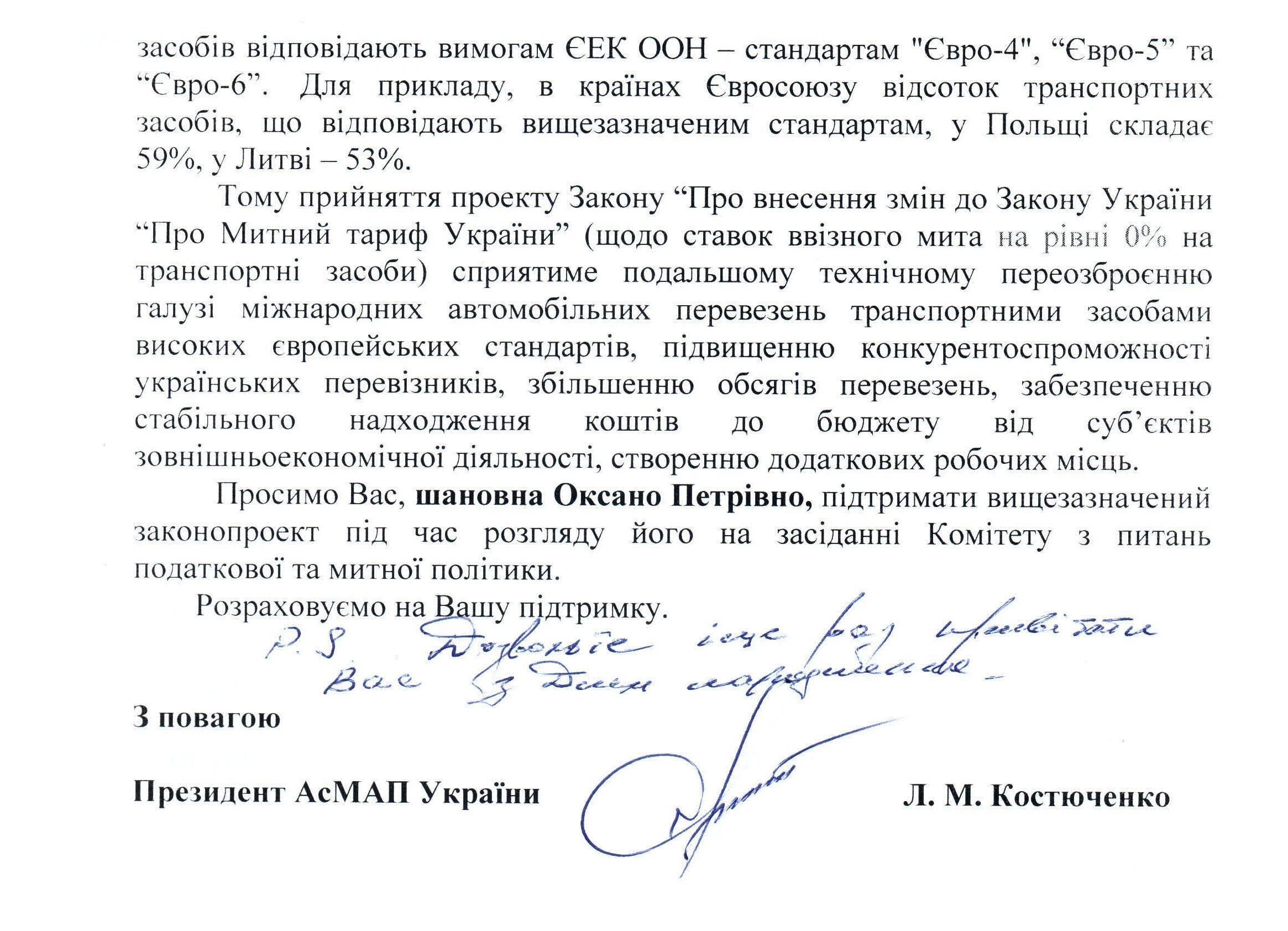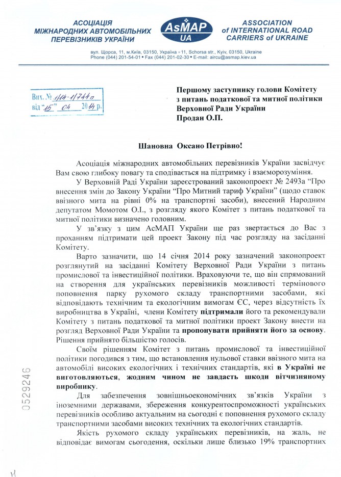 Вхідна документація > Звернення АсМАП України щодо необхідності підтримки законопроекту “Про внесення змін до Закону України “Про Митний тариф України” (щодо ставок ввізного мита на рівні 0% на транспортні засоби), реєстр. №2493а