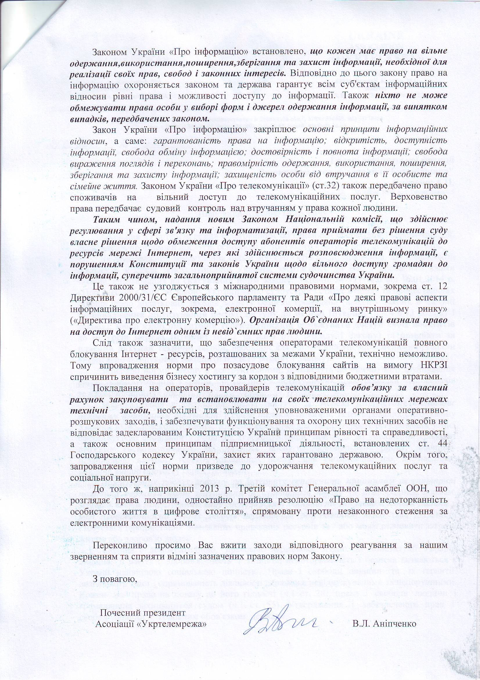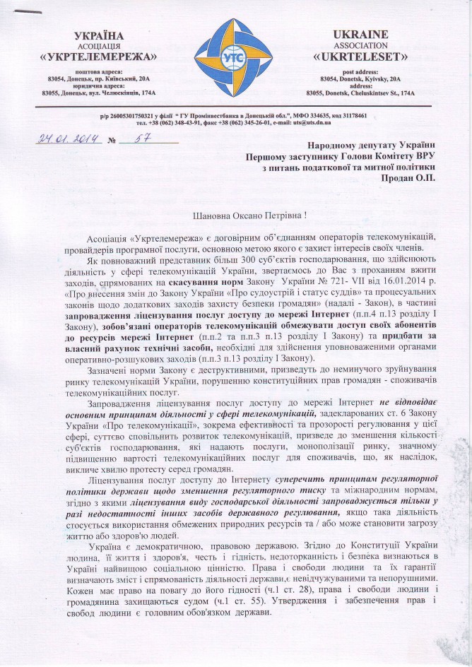 Звернення Асоціації “Укртелемережа” щодо необхідності скасування норм Закону України “Про судоустрій і статус суддів” та процесуальних законів щодо додаткових заходів захисту безпеки громадян”, які негативно вплинуть на діяльність ринку телекомунікацій України