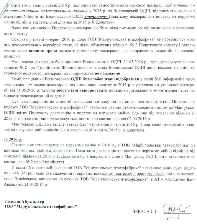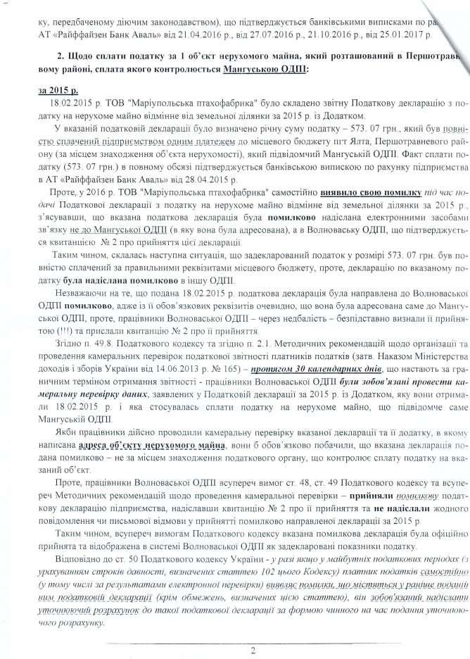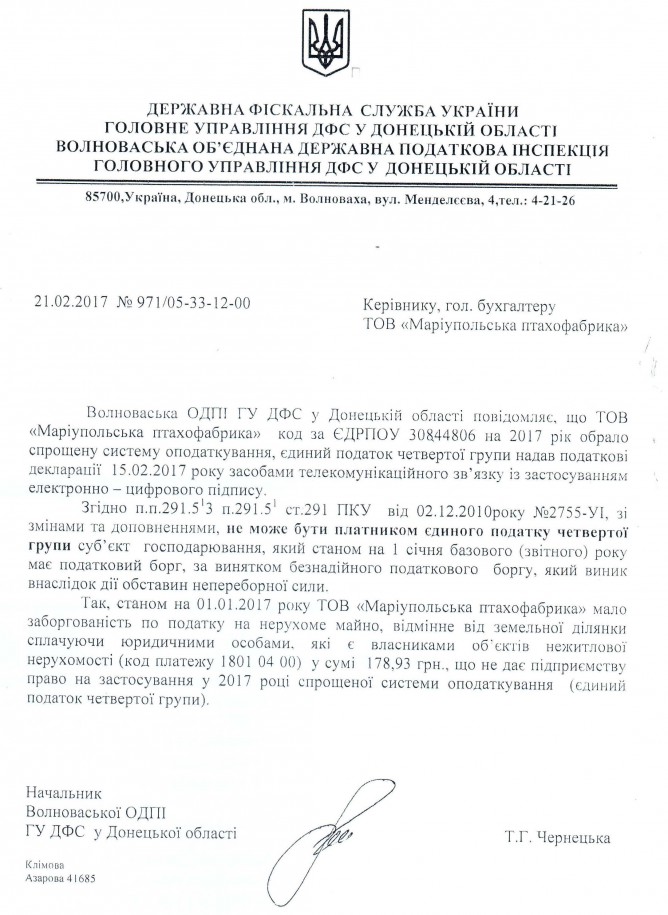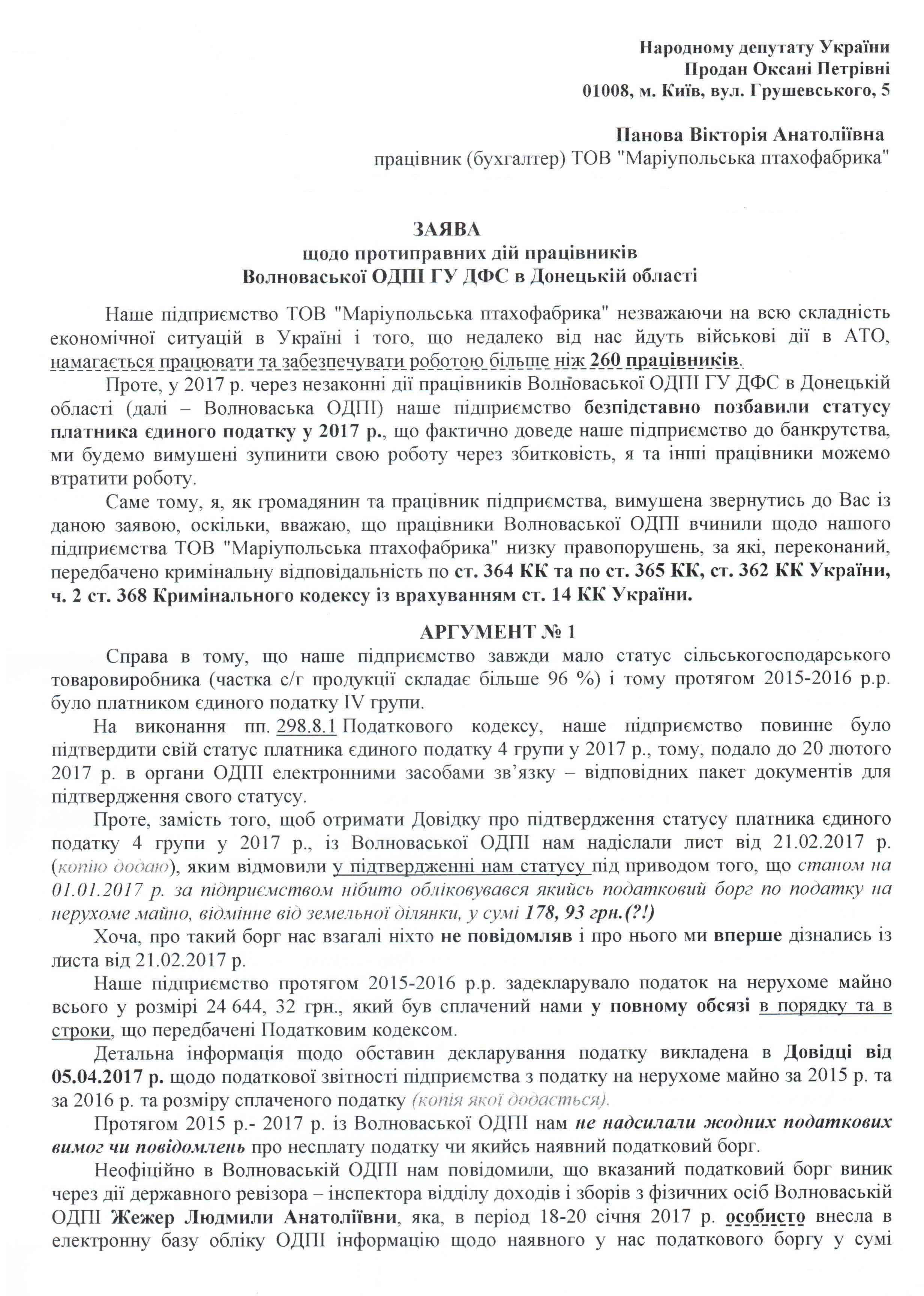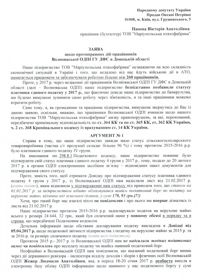 18Тра Коментування вимкнено Звернення бухгалтера ТОВ “Маріупольська птахофабрика” В.А. Панової щодо протиправних дій співробітників Волноваської ОДПІ ГУ ДФС у Донецькій області
