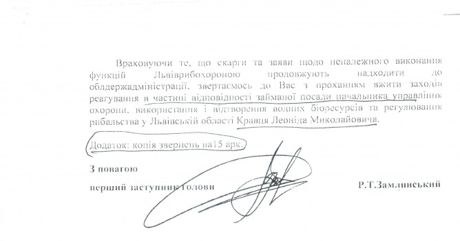 Звернення депутата Львівської обласної ради щодо звільнення із займаної посади керівника Львіврибохорони