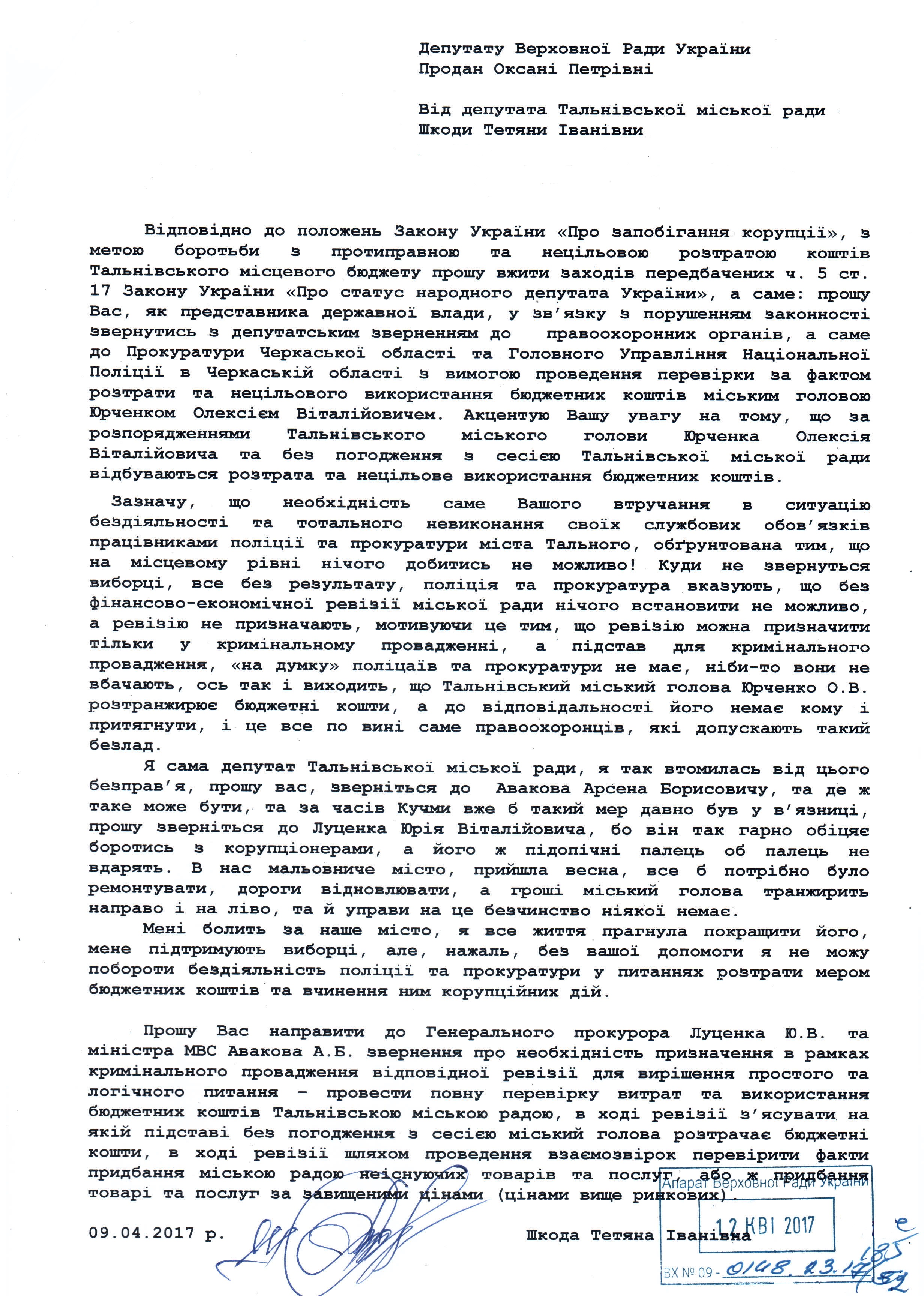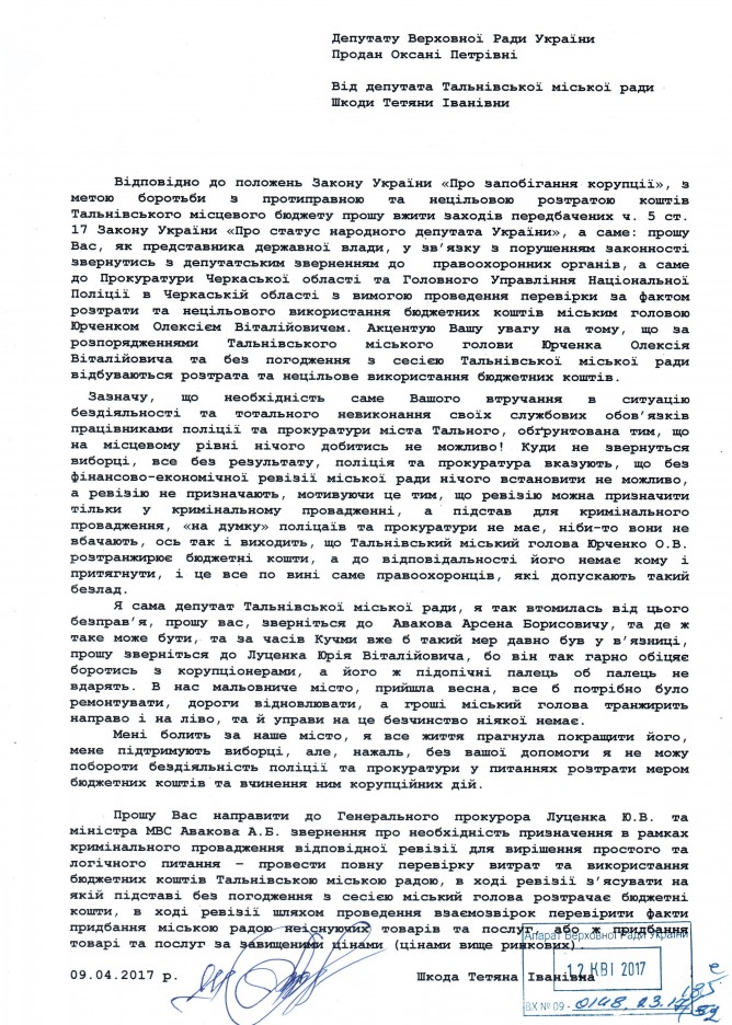 Головна > Верховна Рада України > Вхідна документація > Звернення депутата Тальнівської міської ради Шкоди Т.І. щодо нецільового використання бюджетних коштів та бездіяльності правоохоронних органів м. Тальне