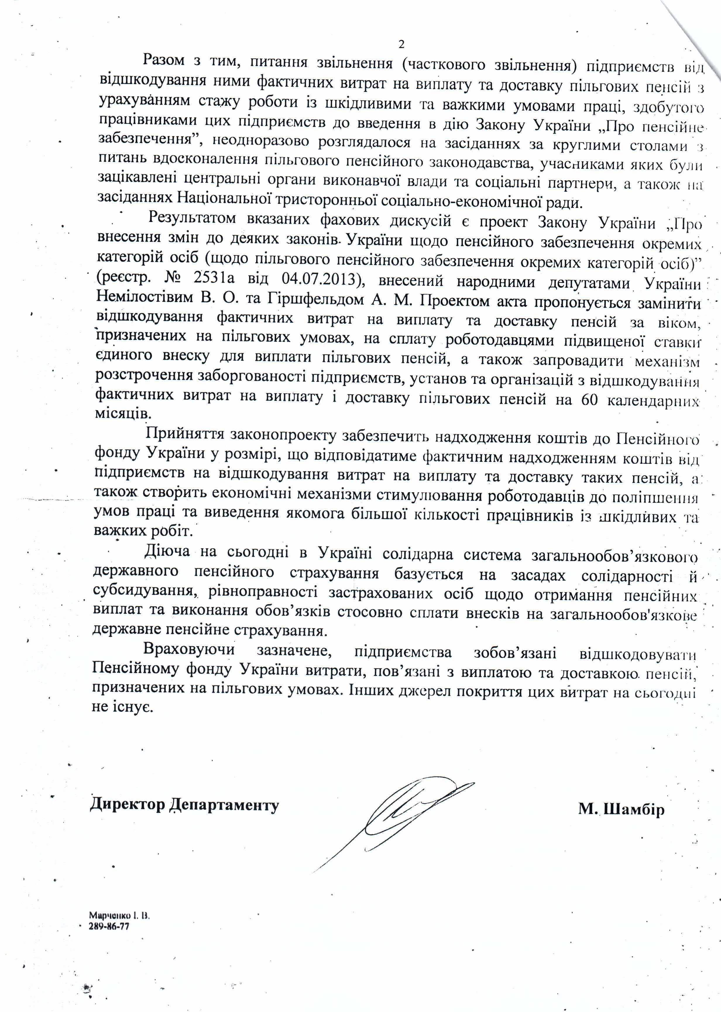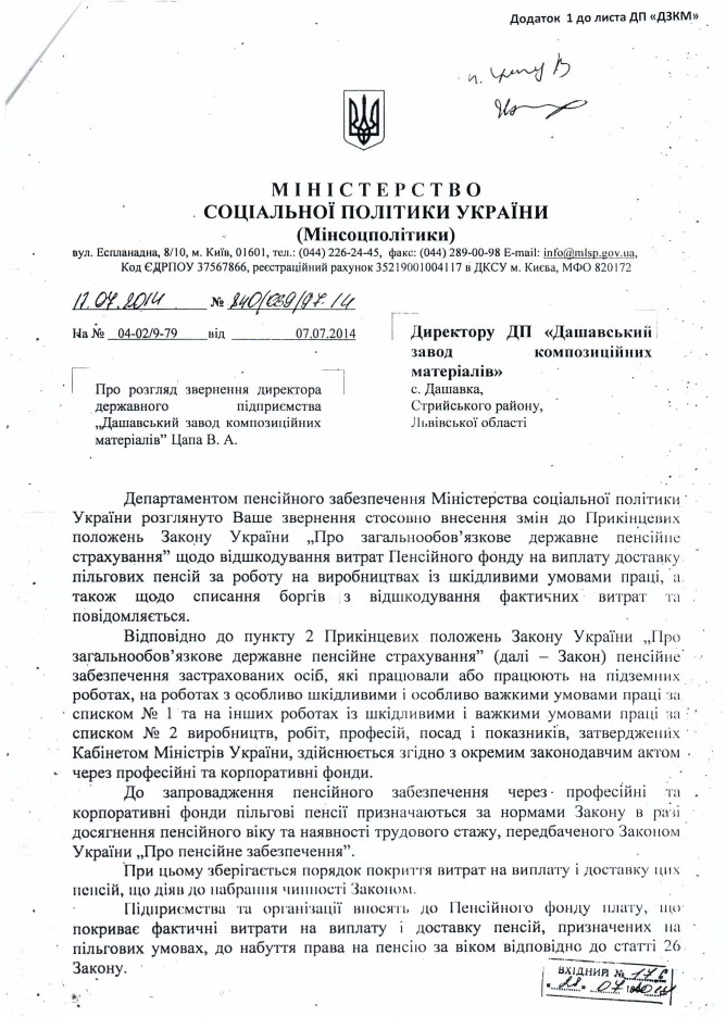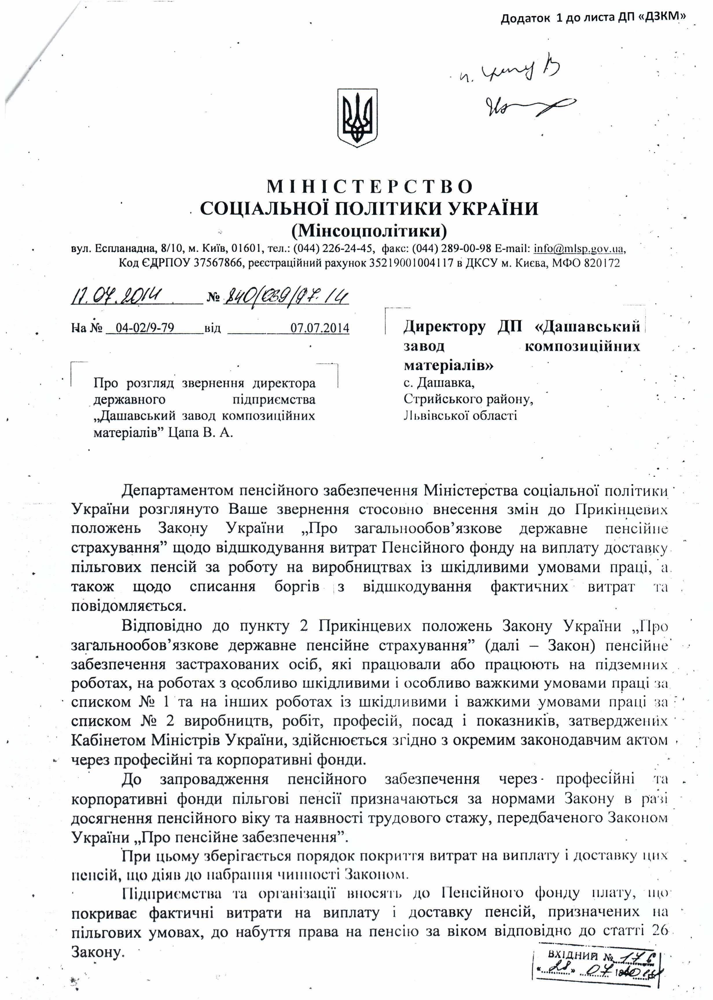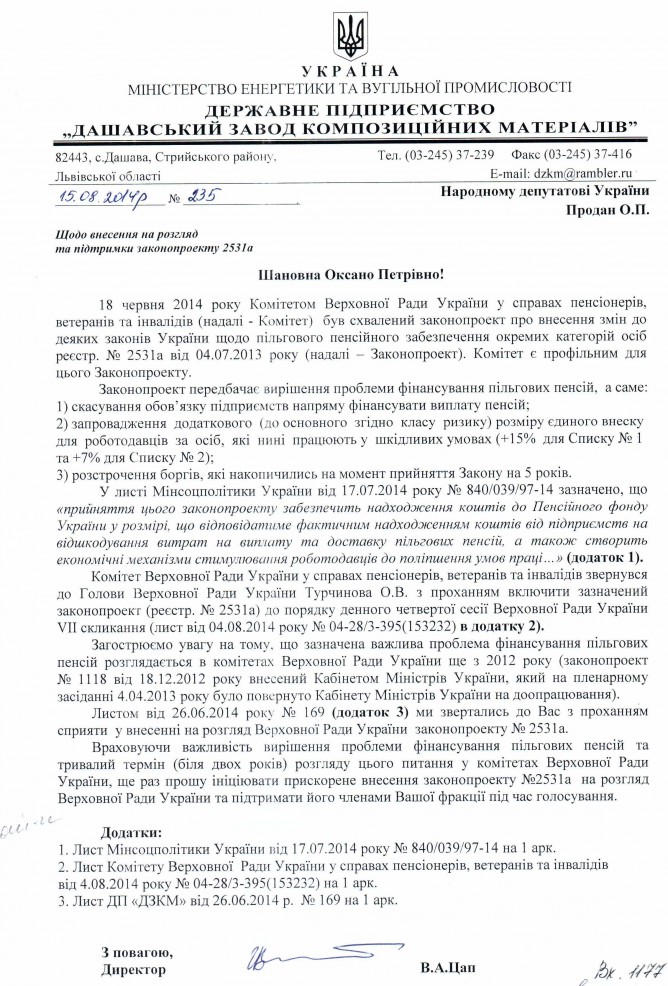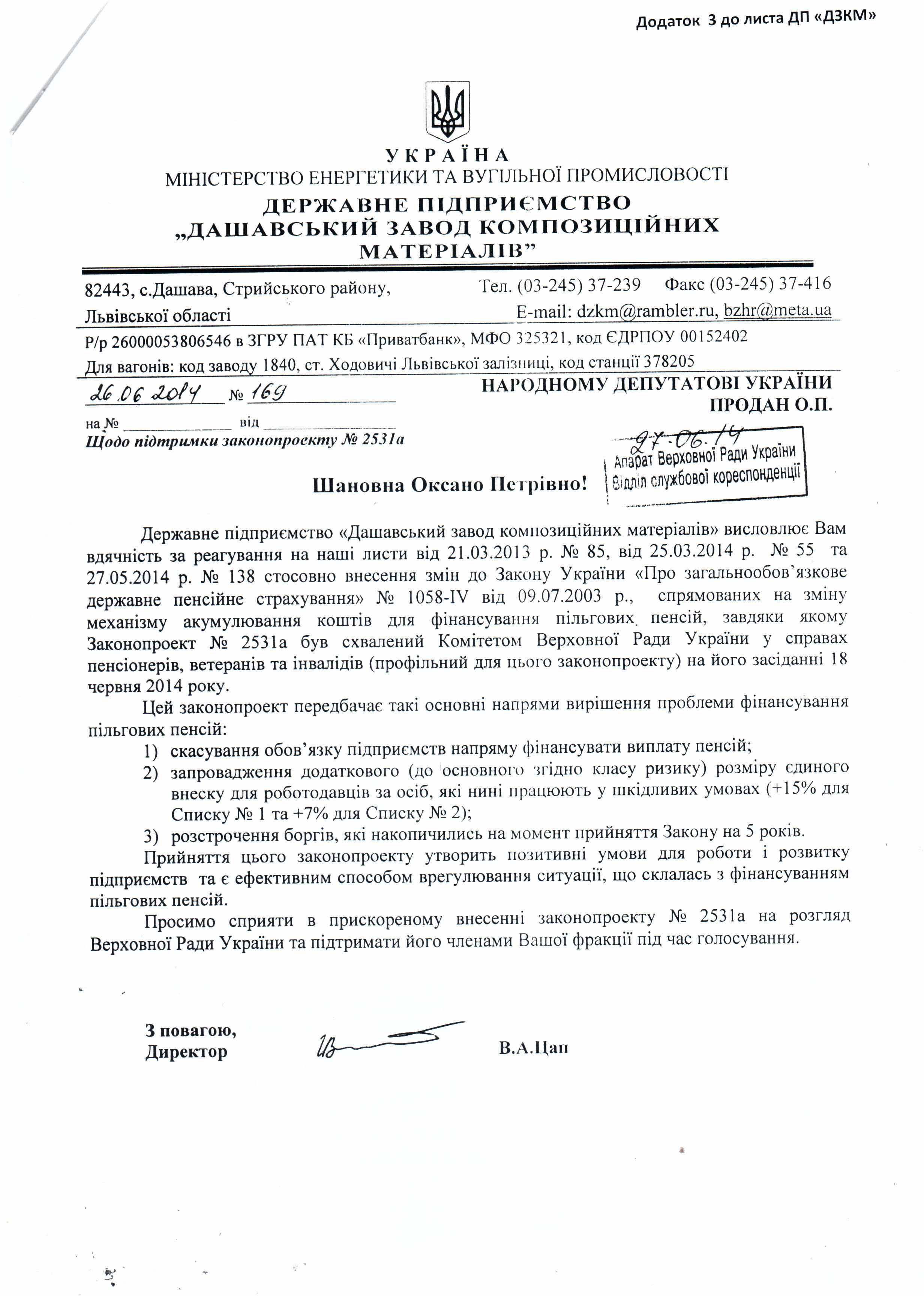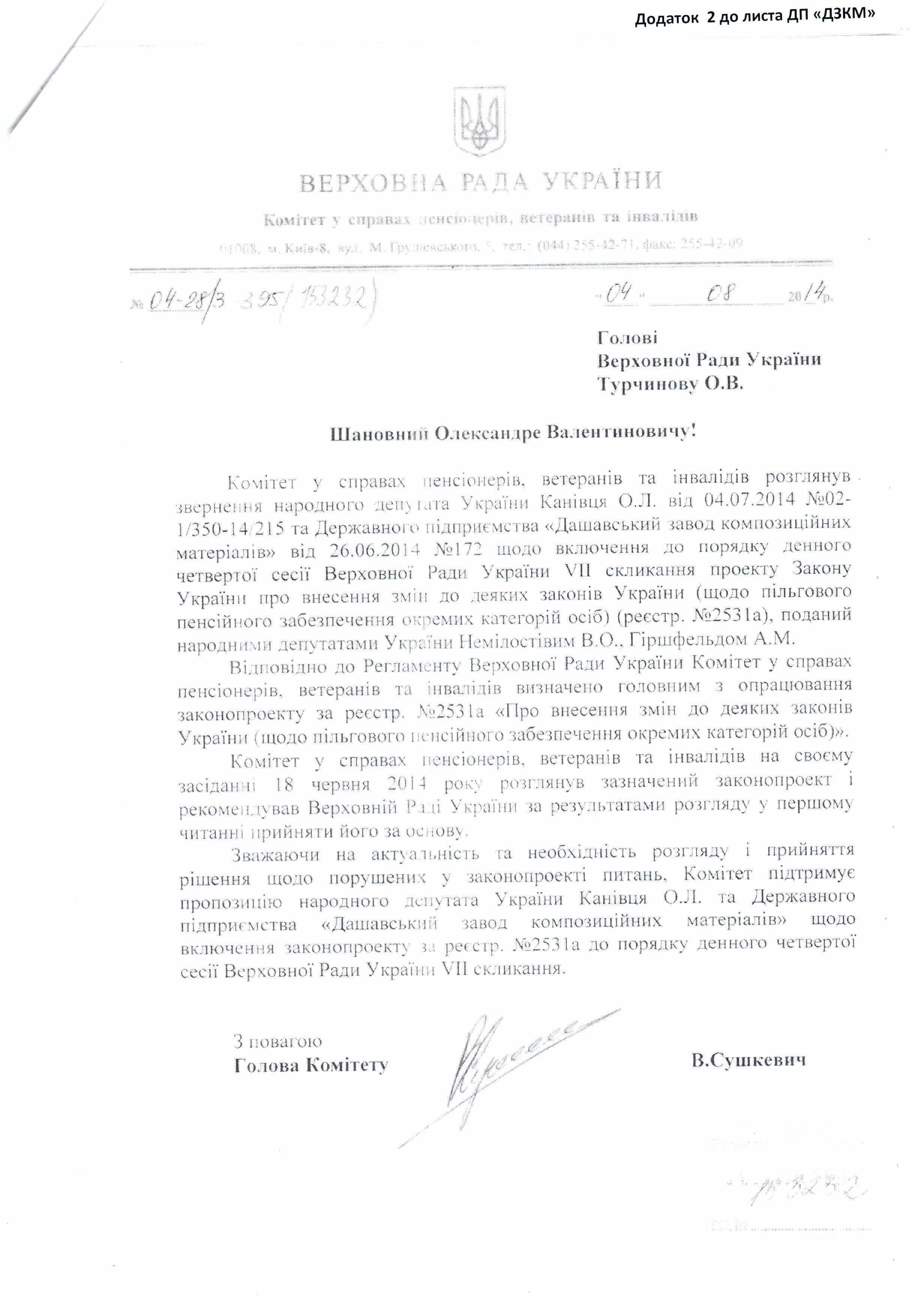 Звернення ДП “Дашавський завод композиційних матеріалів” щодо підтримки законопроекту “Про внесення змін до деяких законів України щодо пільгового пенсійного забезпечення окремих категорій осіб”, реєстр. №2351а