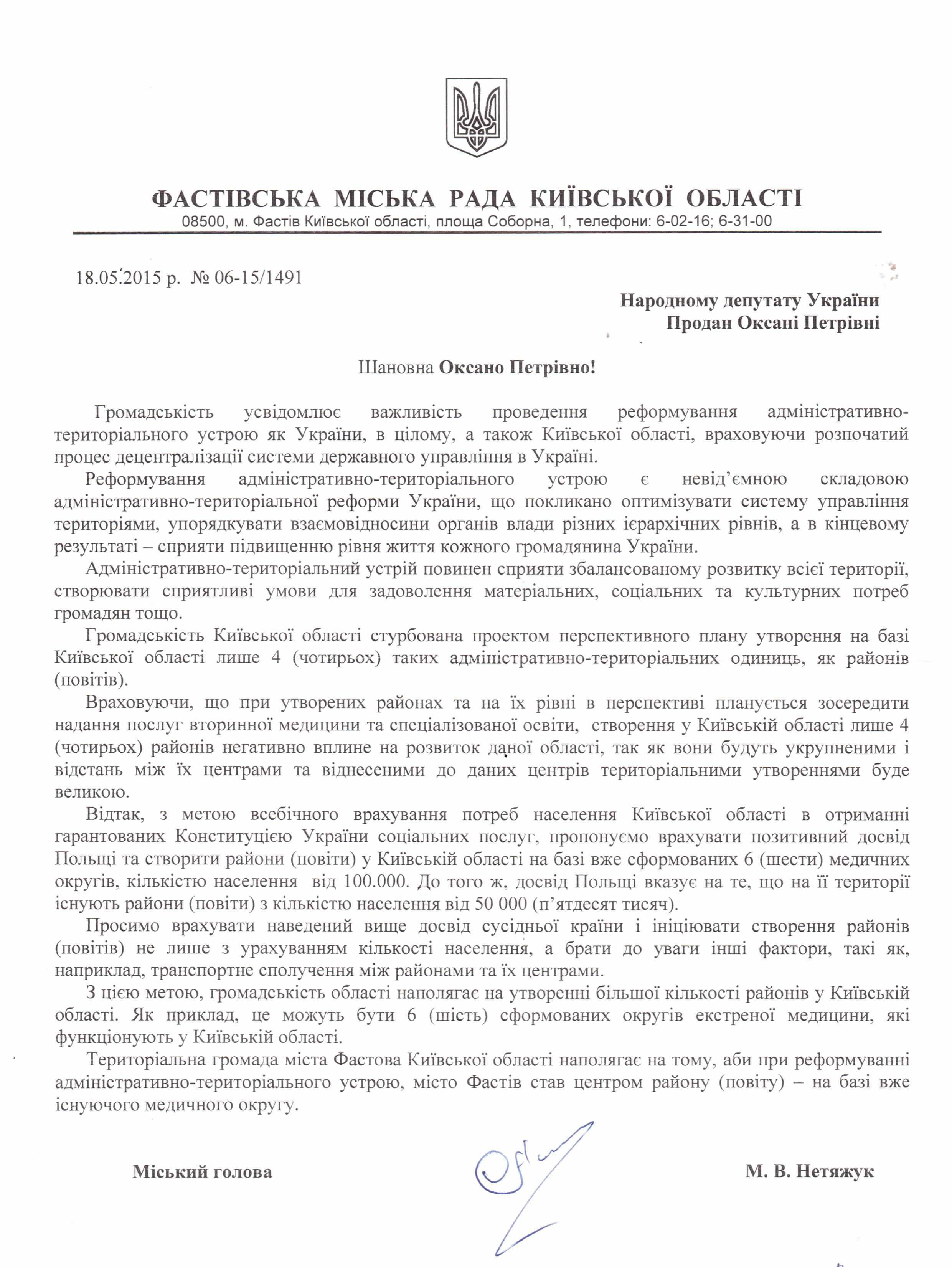 14Лип Коментування вимкнено Звернення Фастівської міської ради щодо вимог територіальної громади міста зробити м. Фастів районним центром при реформуванні адміністративно-територіального устрою