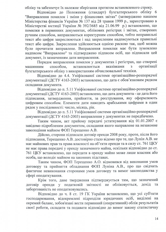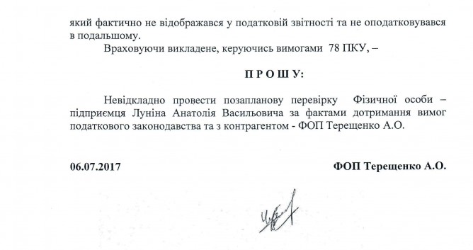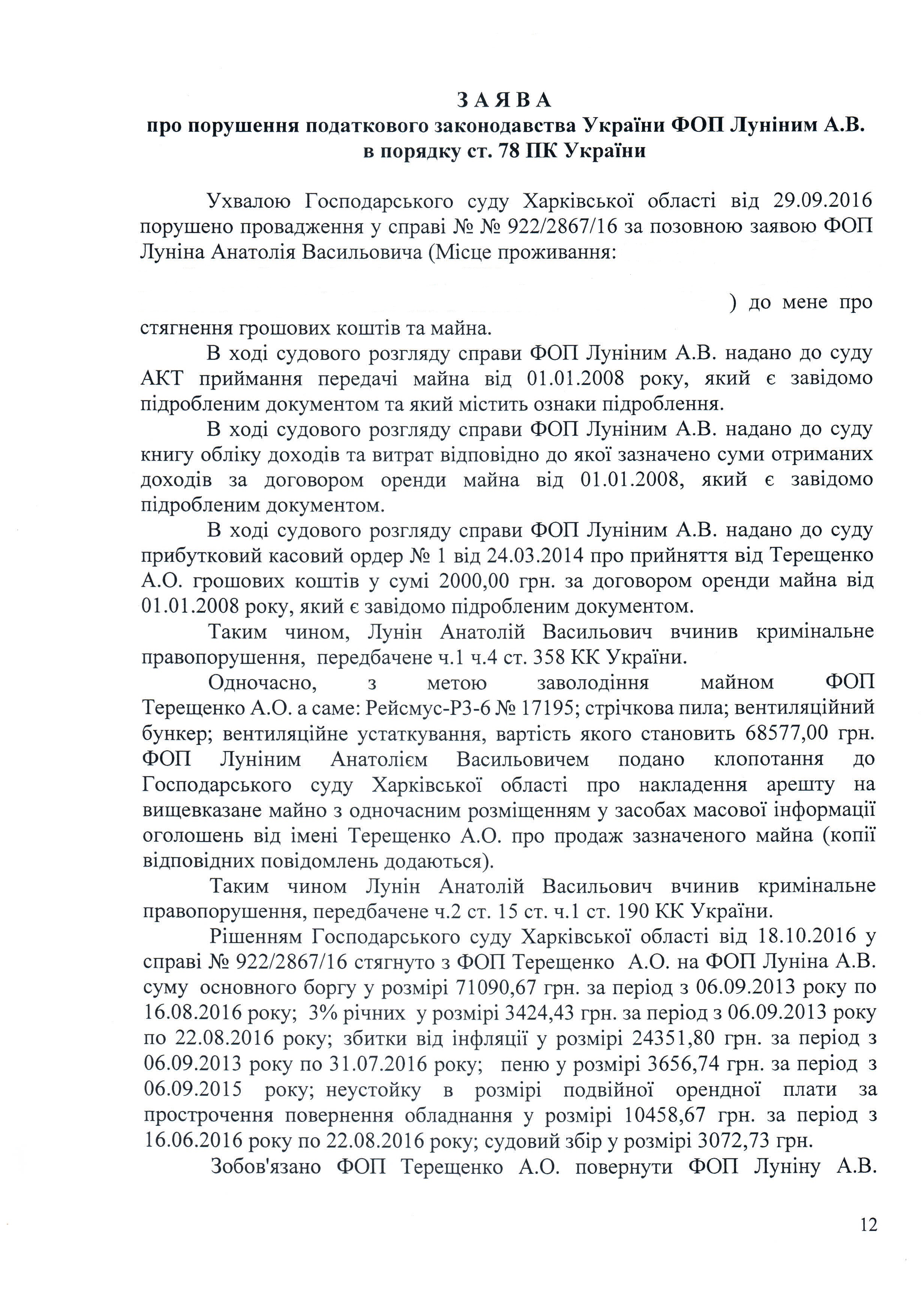 09Сер Коментування вимкнено Звернення ФОП Терещенка А.О. щодо надання недостовірної інформації до суду та порушення податкового законодавства ФОП Луніним А.В.