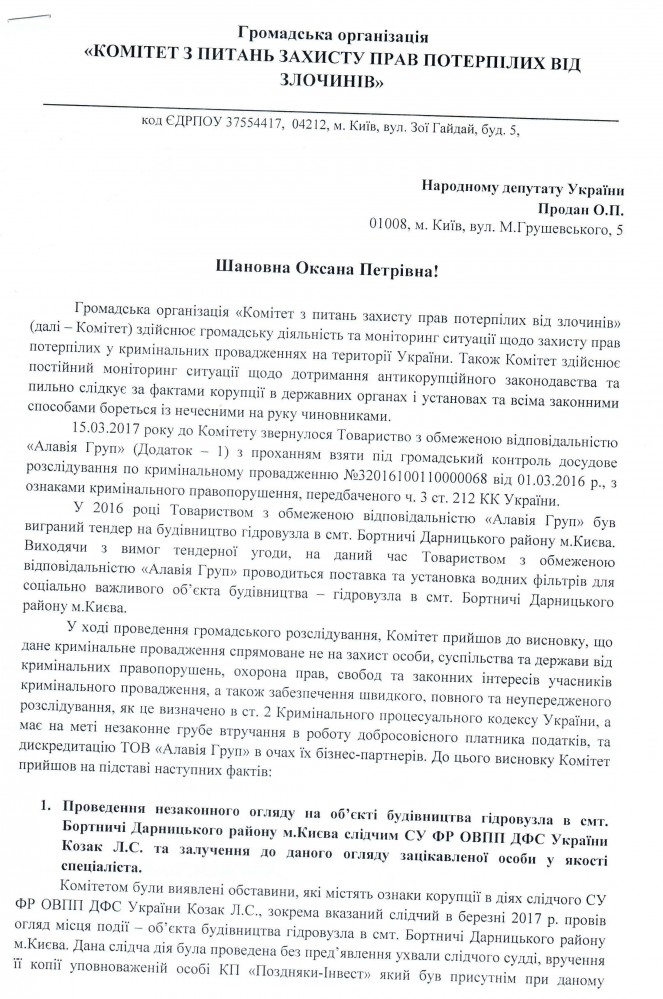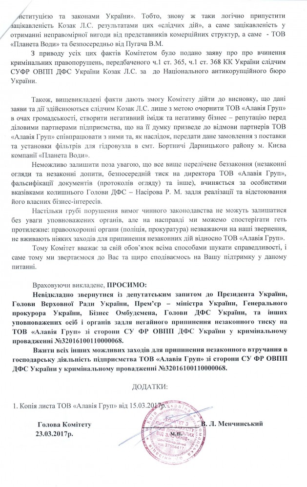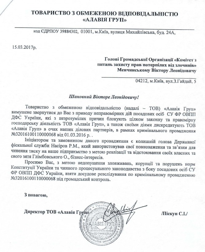 18Кві Коментування вимкнено Звернення ГО “Комітет з питань захисту прав потерпілих від злочинів” щодо перешкоджання співробітниками СУ ФР ОВПП ДФС України господарській діяльності ТОВ “Алавія Груп”