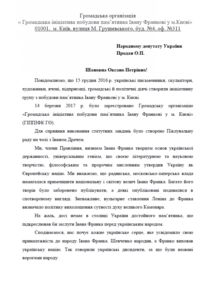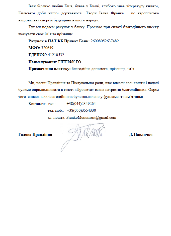 04Лип Коментування вимкнено Звернення Громадської організації “Громадська ініціатива побудови пам’ятника Івану Франку у м. Києві” щодо надання благодійної допомоги на побудову пам’ятника Івану Франку у м. Києві