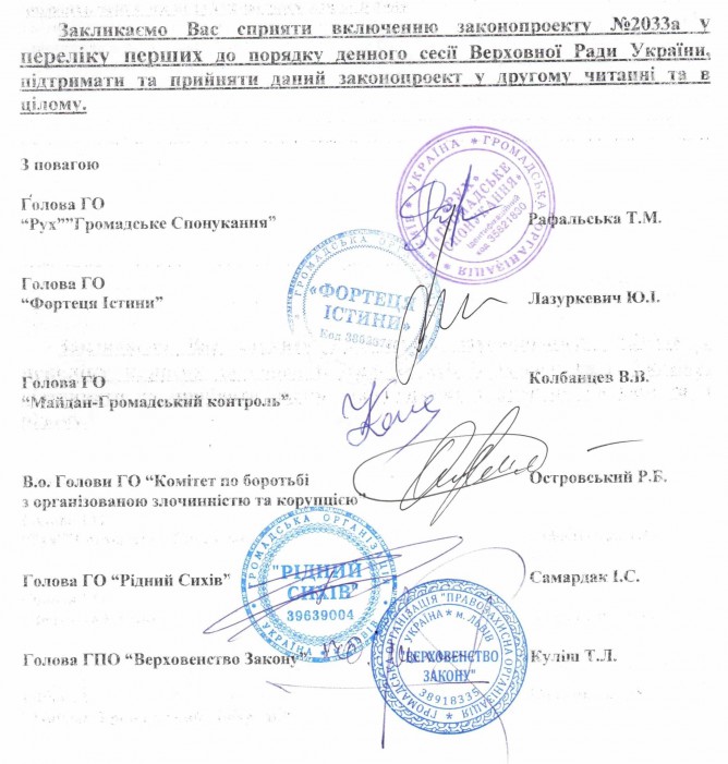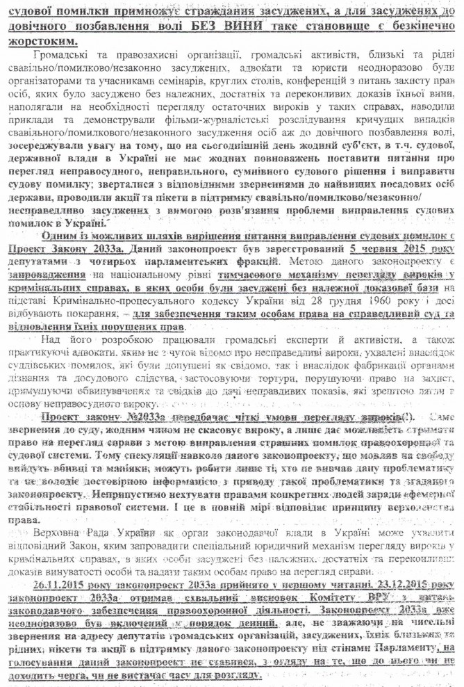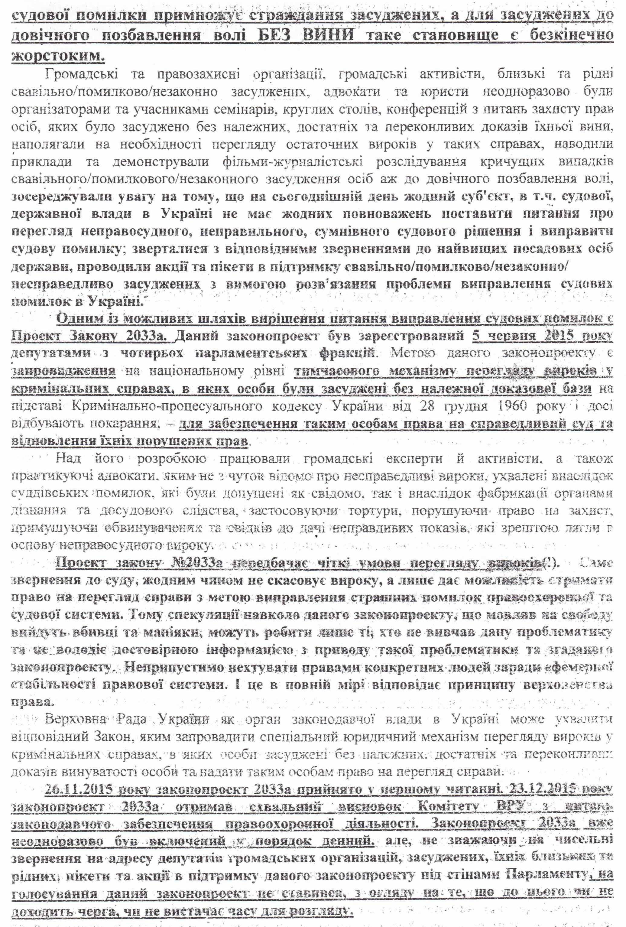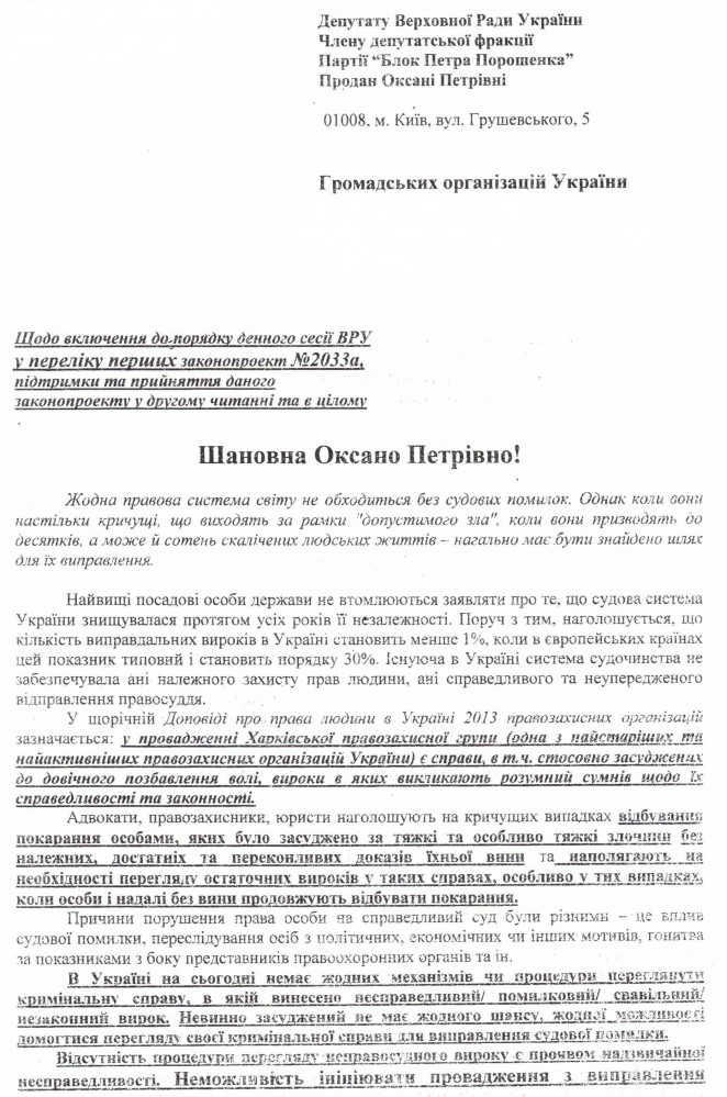Вхідна документація > Звернення громадських організацій щодо сприяння включенню до переліку першочергових законопроектів проекту Закону України “Про внесення змін до Кримінального процесуального кодексу України (щодо забезпечення окремим категоріям засуджених осіб права на правосудний вирок), реєстр. №2033а