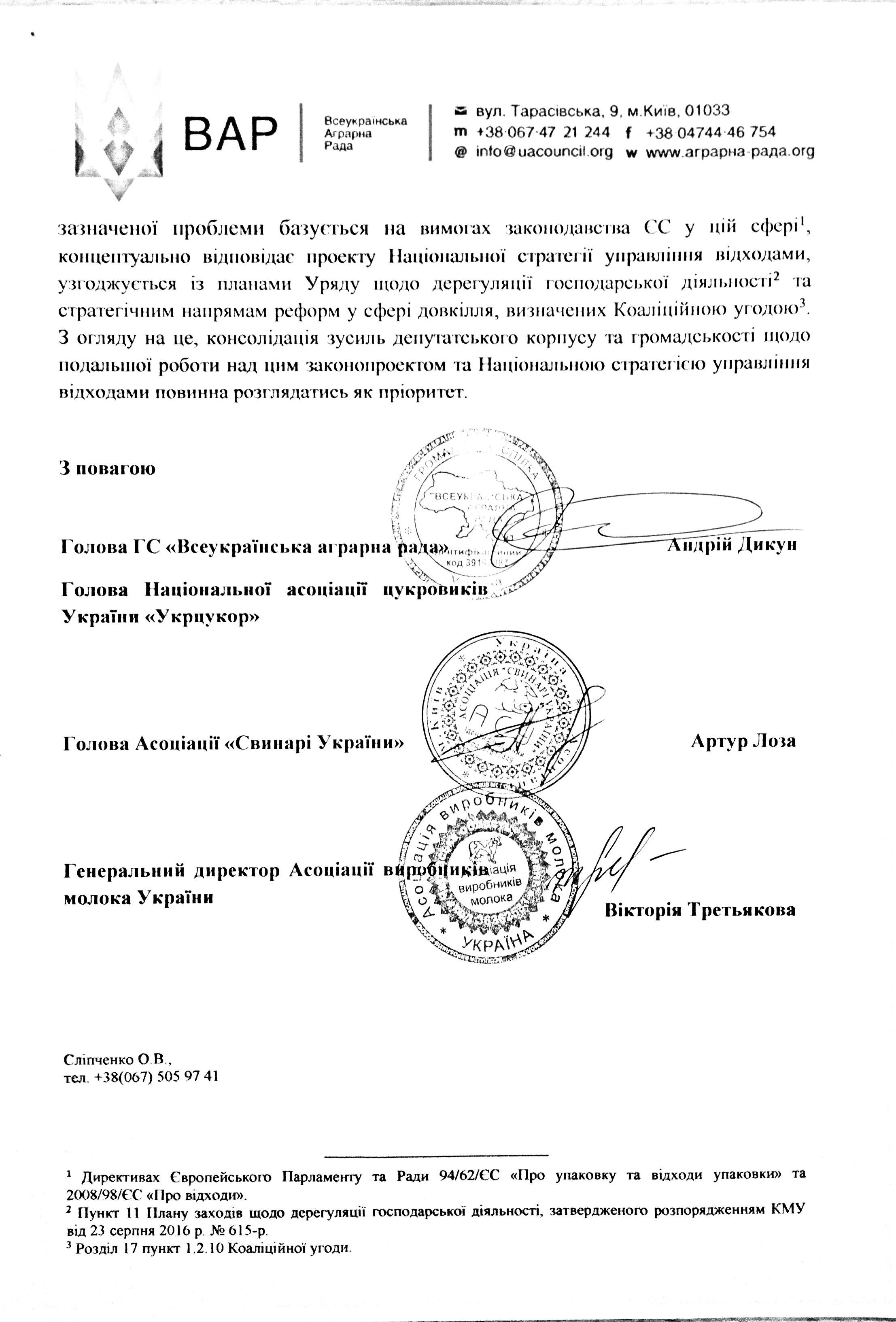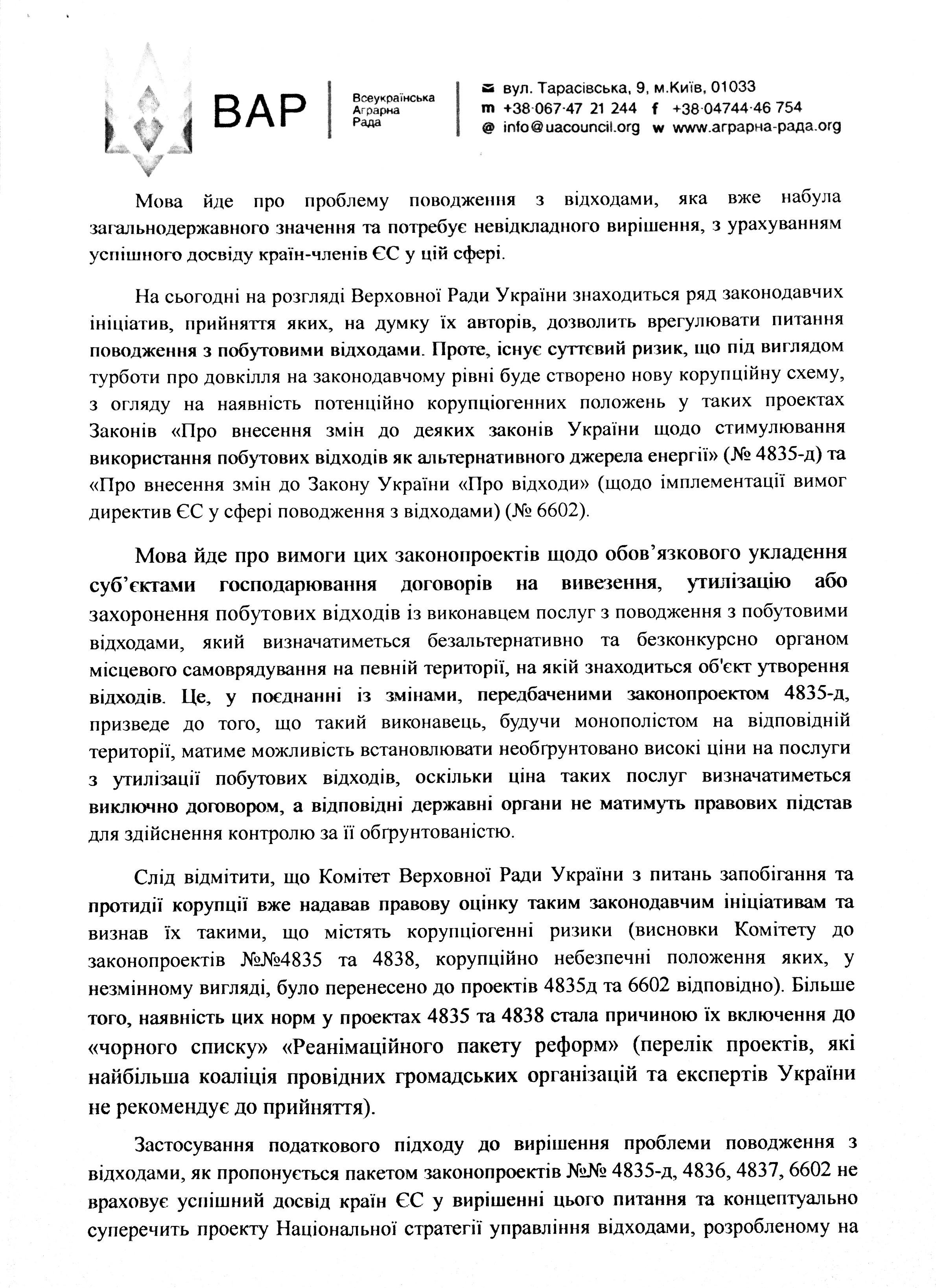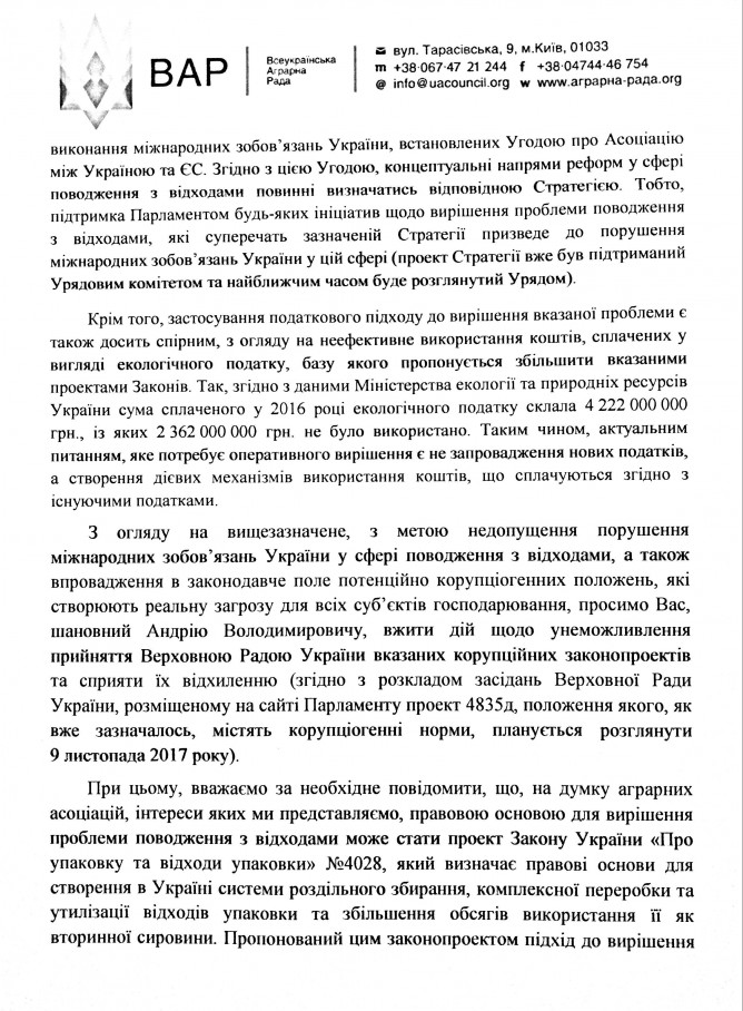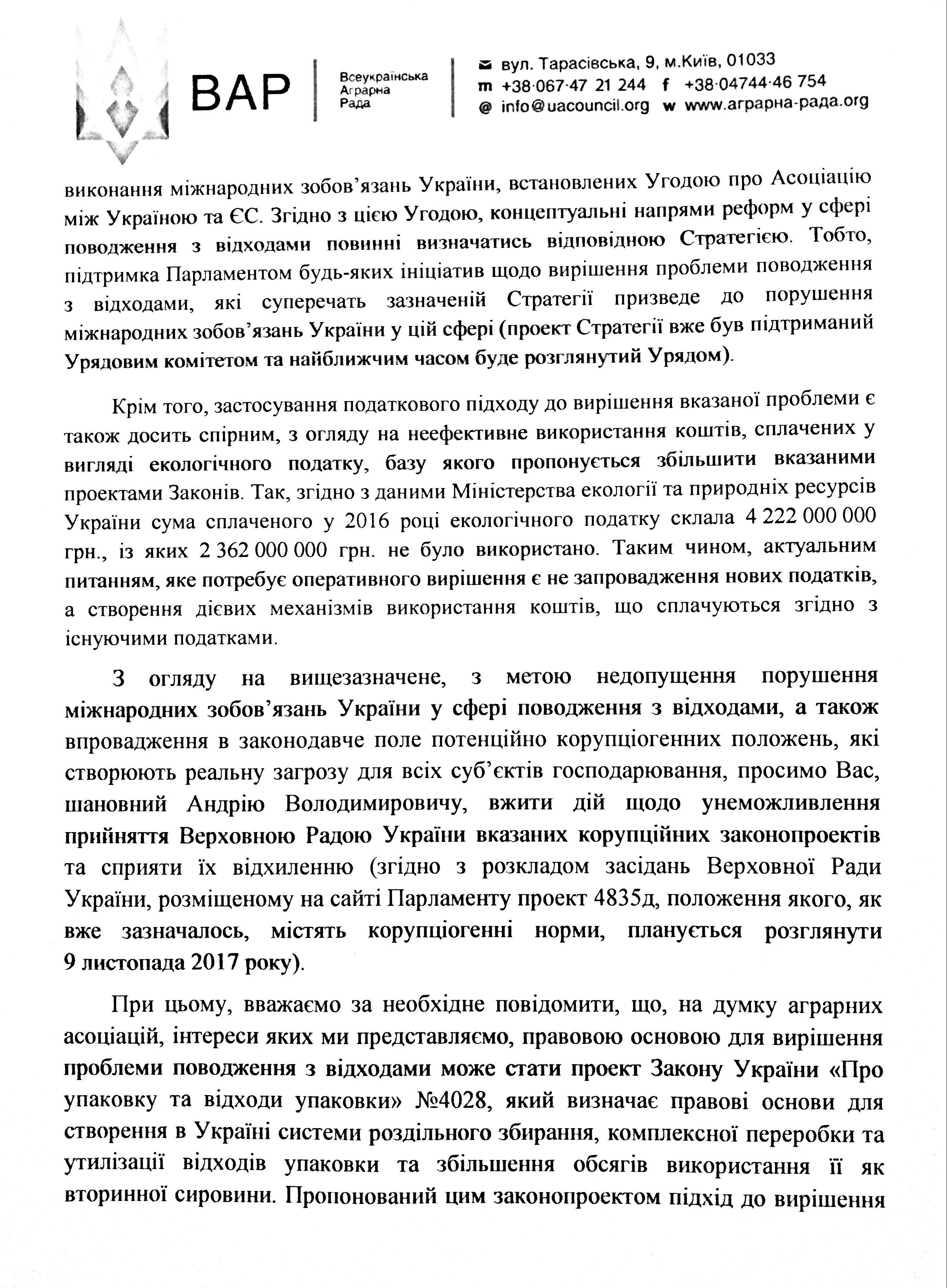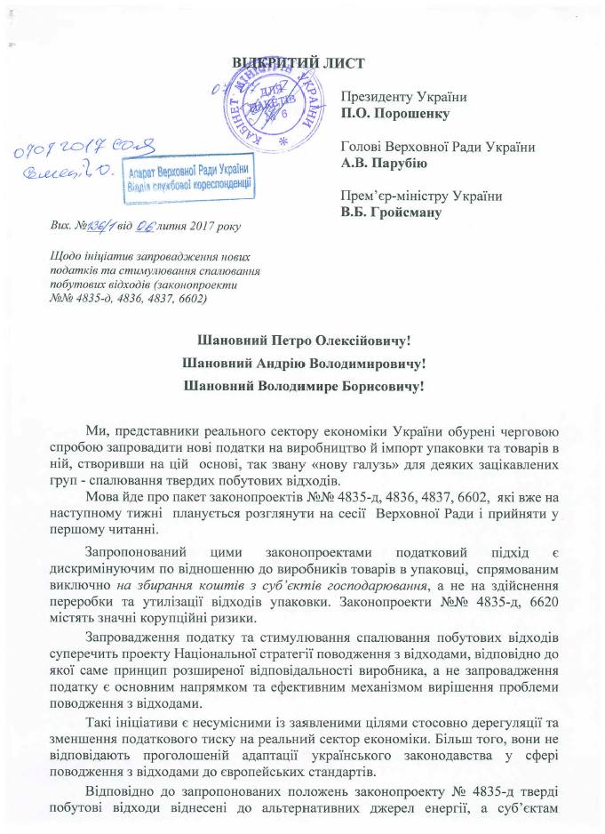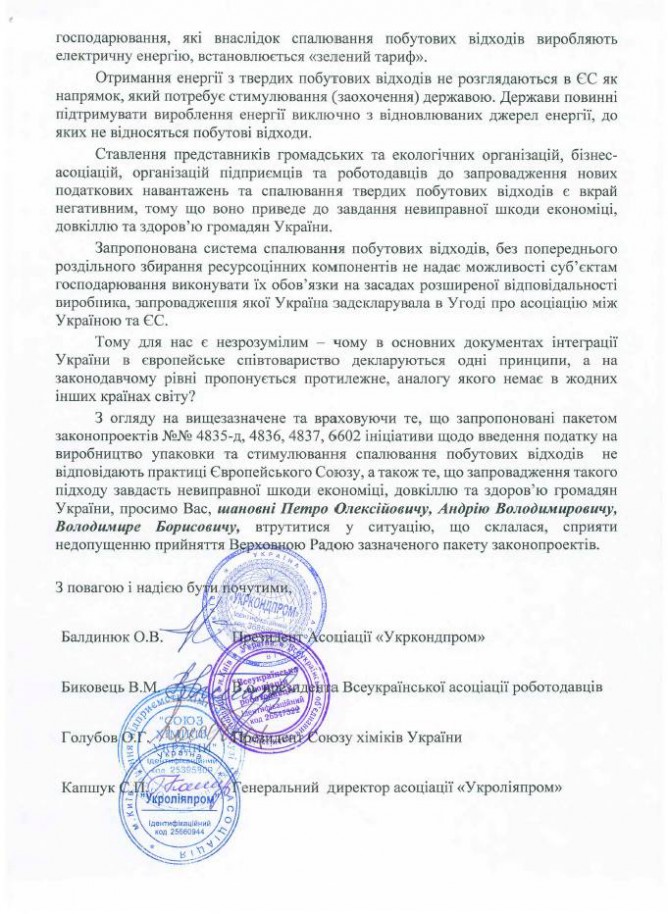 Надсилаю Вам листи авторитетних асоціацій та організацій щодо неприйнятності прийняття законопроектів № 4836 про податок на упаковку та № 4835-д щодо зеленого тарифу на спалювання побутових відходів.
