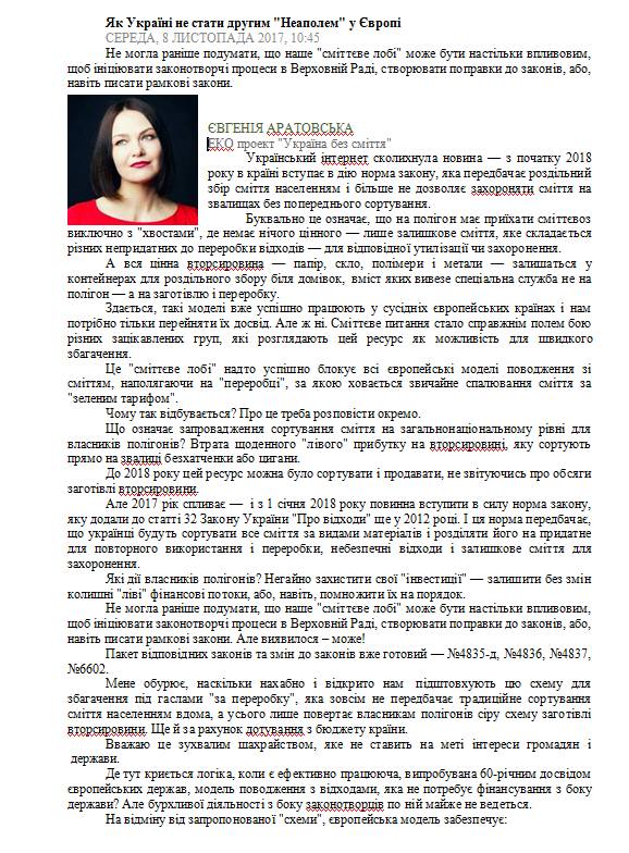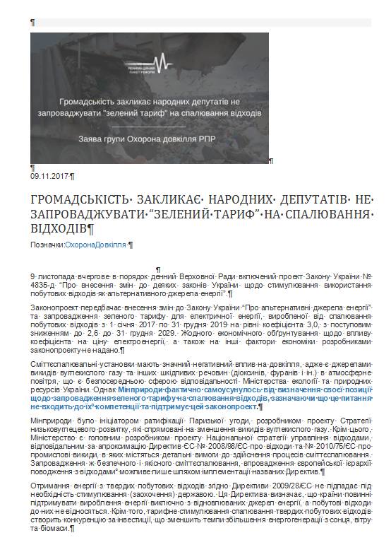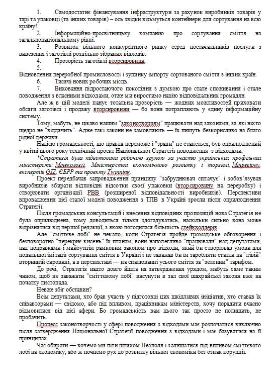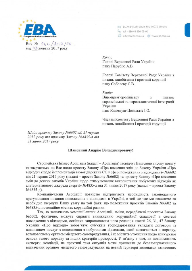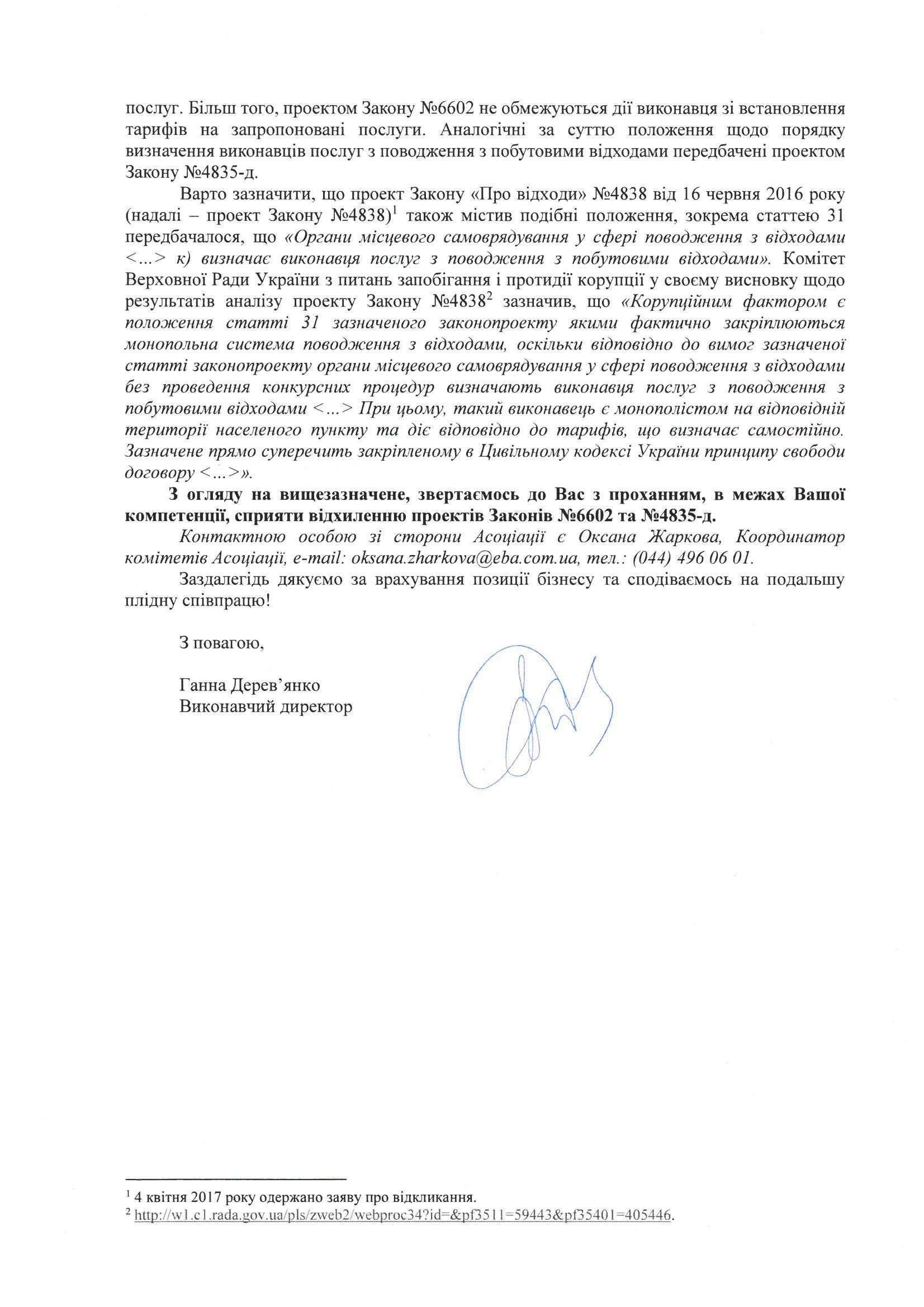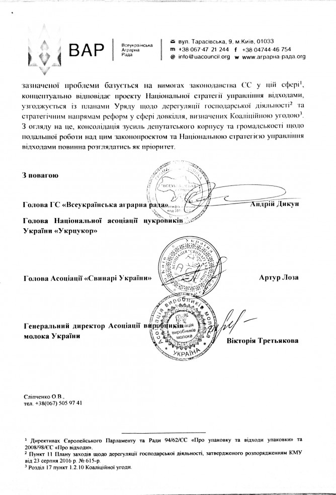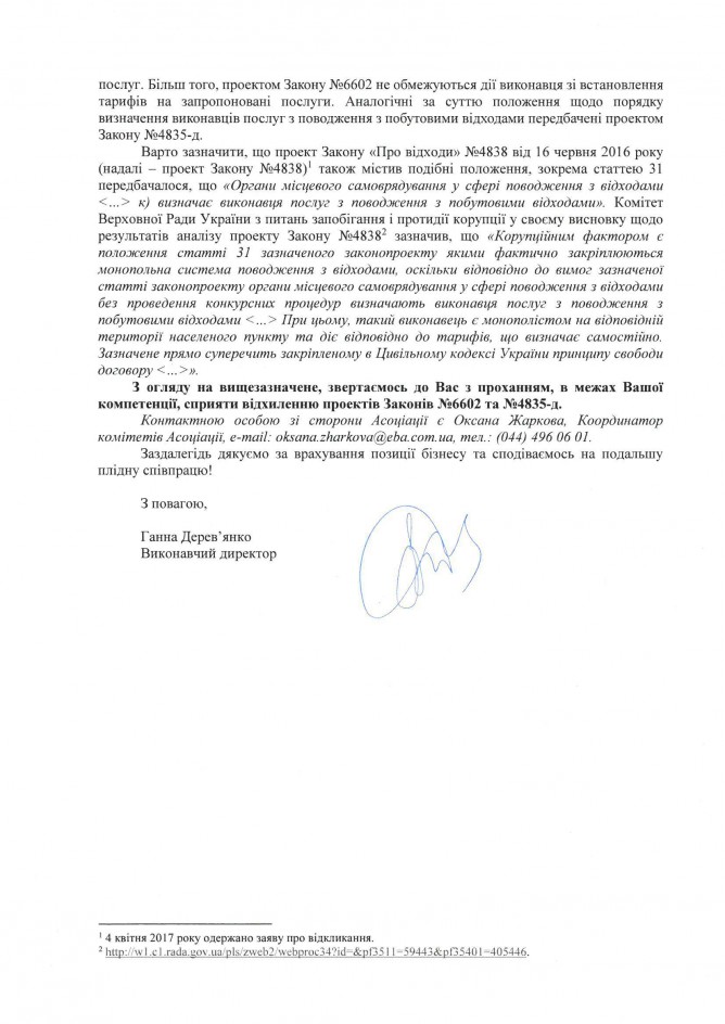 Надсилаю Вам листи авторитетних асоціацій та організацій щодо неприйнятності прийняття законопроектів № 4836 про податок на упаковку та № 4835-д щодо зеленого тарифу на спалювання побутових відходів.