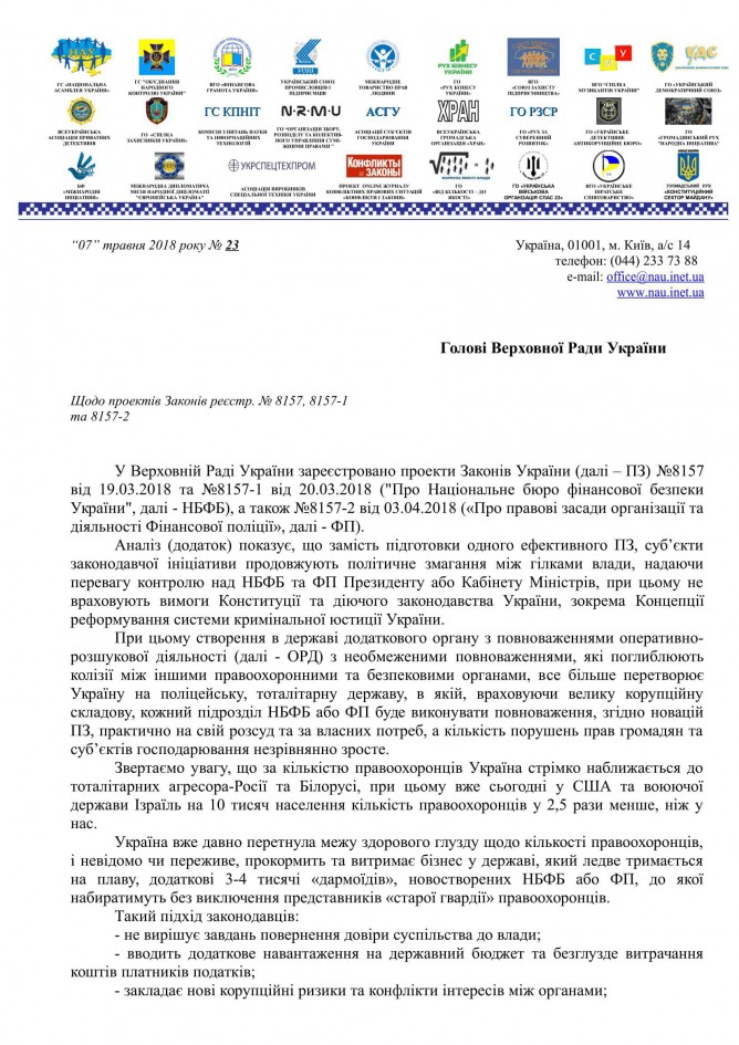 Вхідна документація > Звернення громадських організацій щодо законопроектів “Про Національне бюро фінансової безпеки України”, реєстр. №8157-1 та 8157-2, та “Про правові засади організації та діяльності фінансової поліції”, реєстр. №8157-3